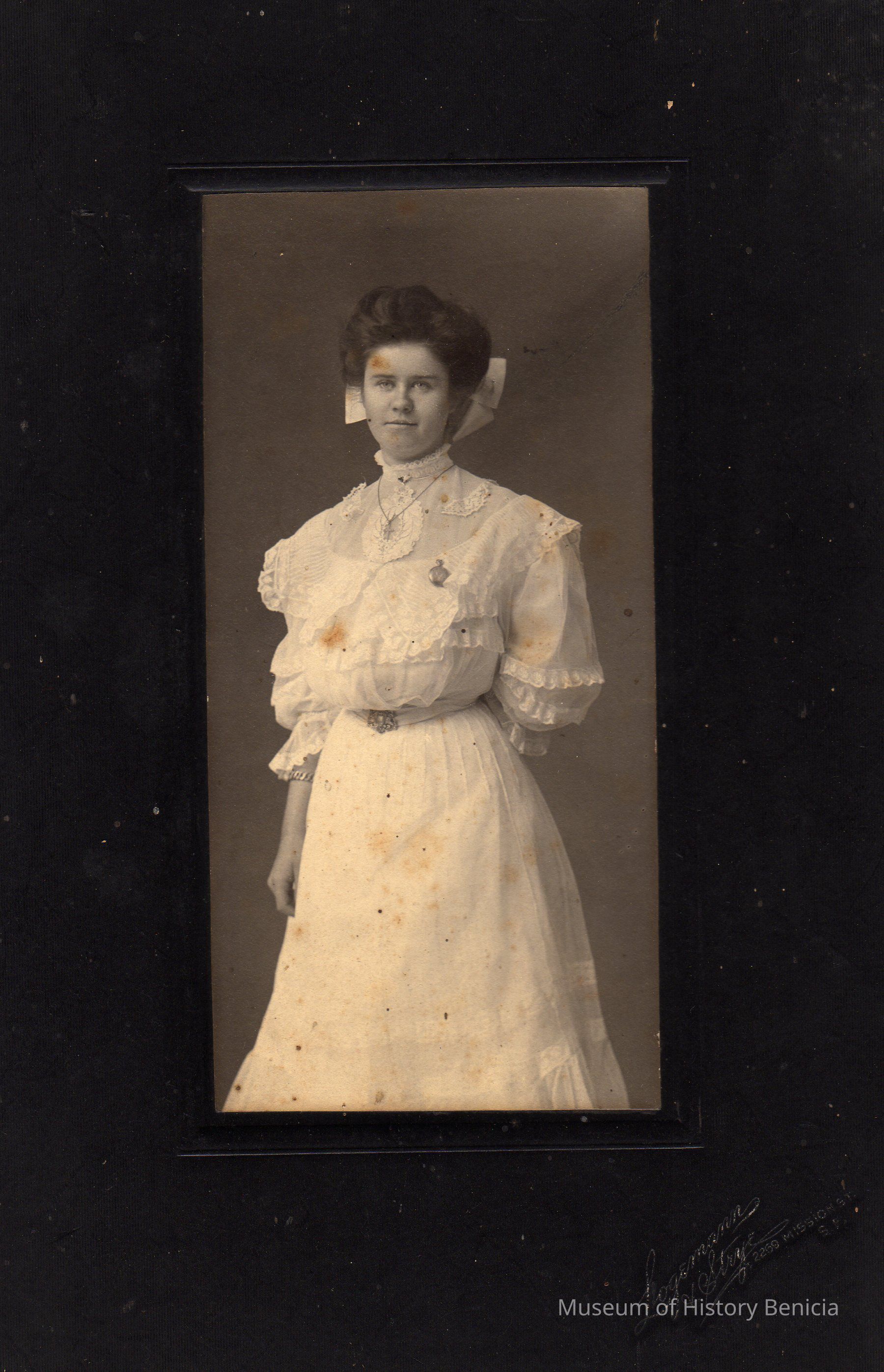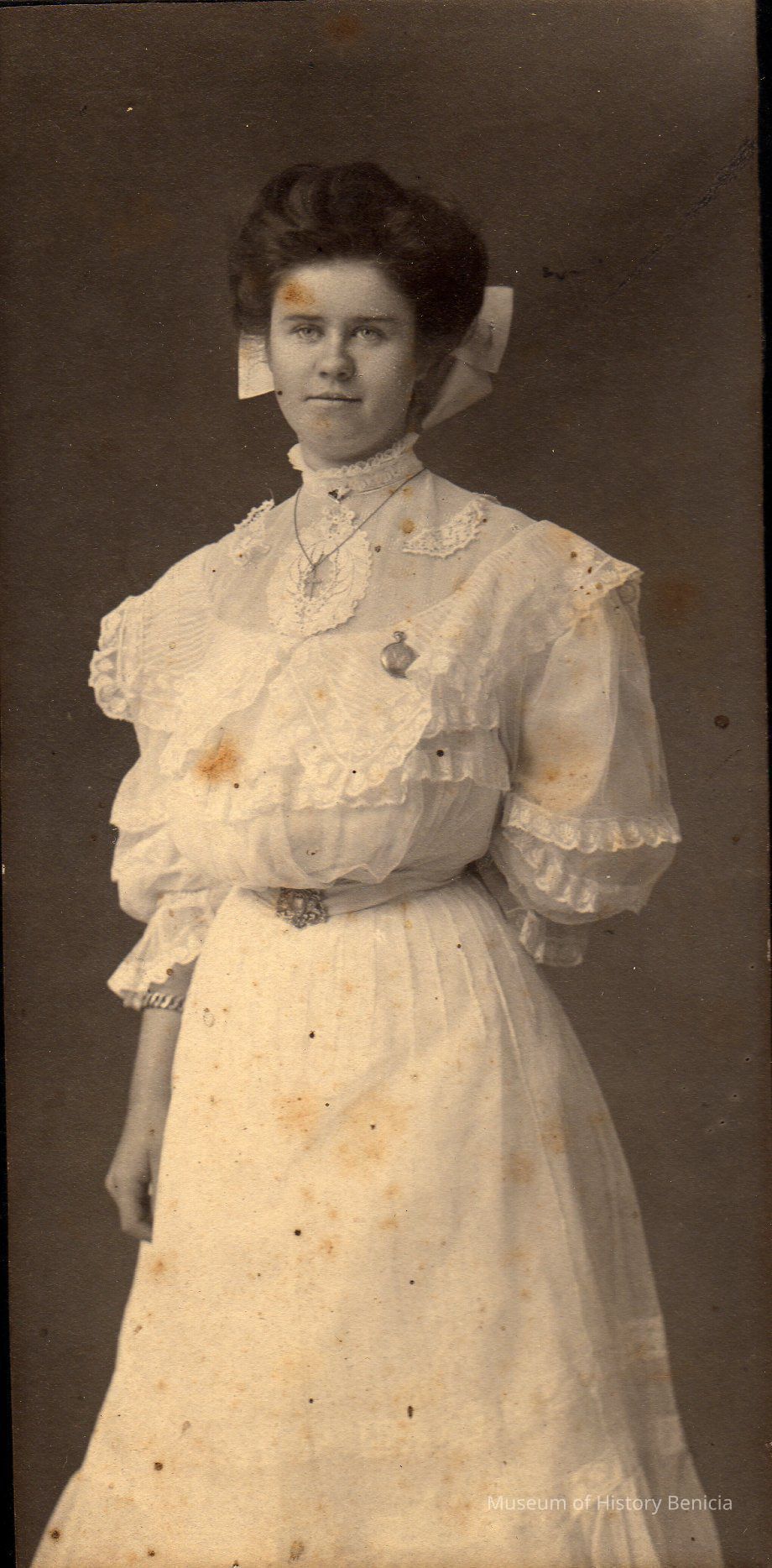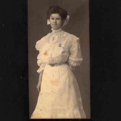 B/W photograph of an unidentified woman wearing a white dress with a large bow in her hair, a necklace, and a watch attached to the front of her dress. She is standing wiith her left hand behind her back.Collection