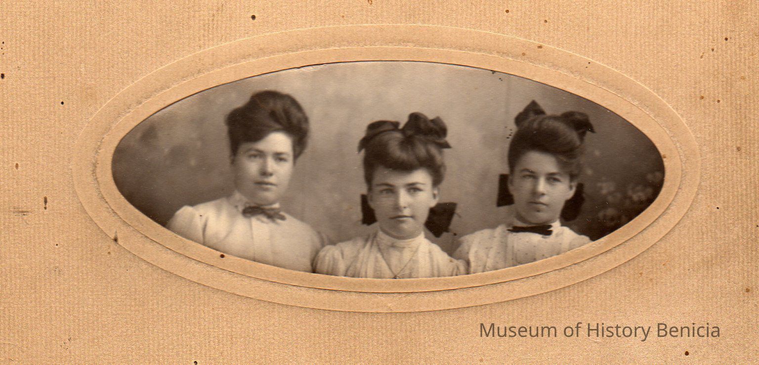 B/W photograph of three unidentified young women in white blouses. The photograph is oval shaped.