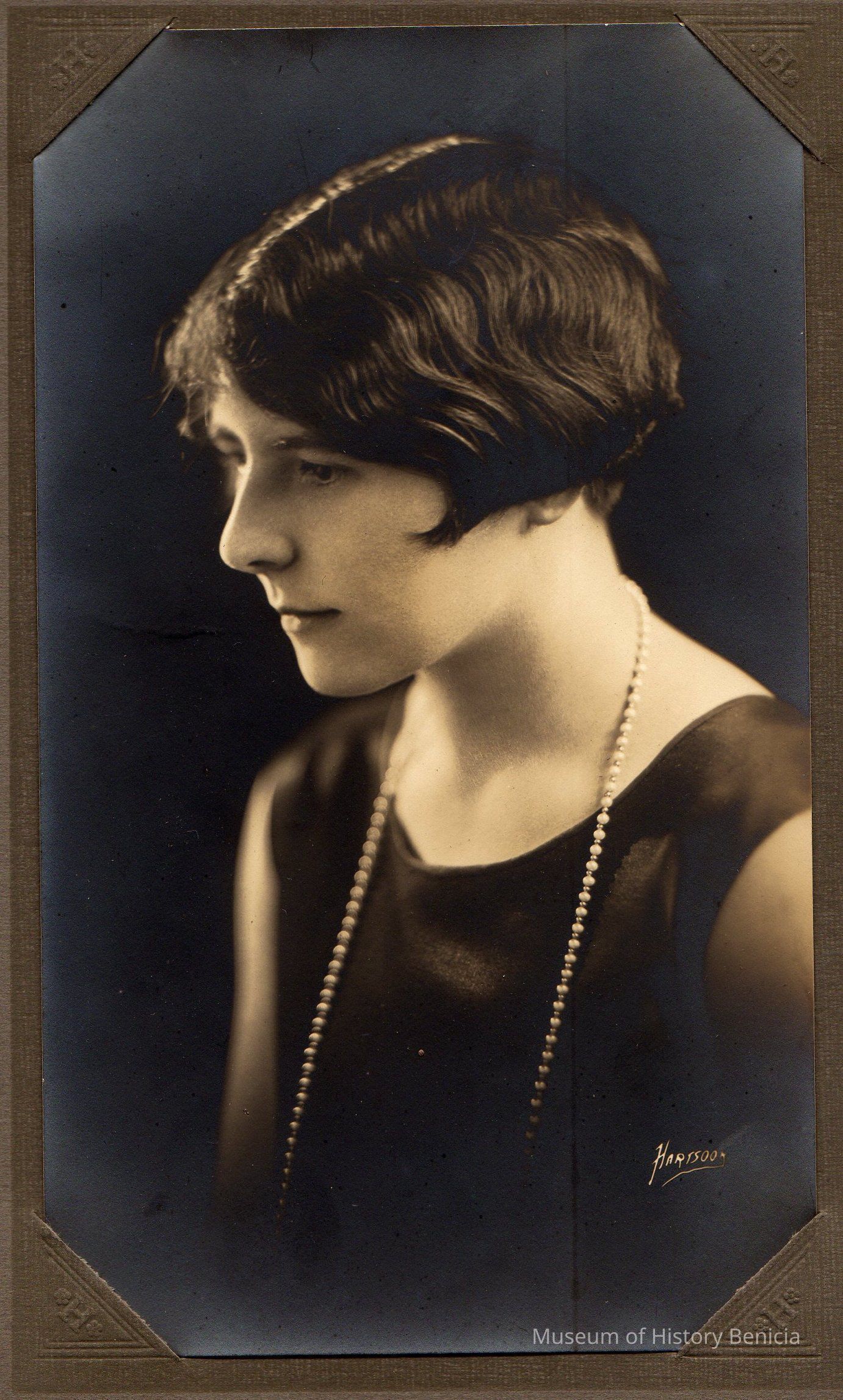 B/W photograph of an unidentified woman facing a way from the camera with a bob haircut. She is wearing a long strand of pearls and a black dress.Collection