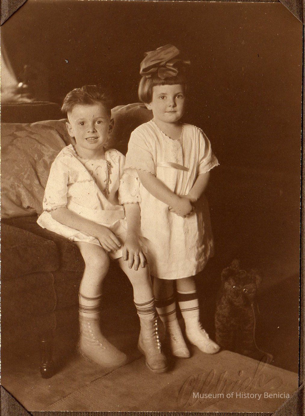 Sepia portrait of a young boy and girl. They are sitting on a couch in what looks like a living room and there is a stuffed animal (dog?) on the floor to the right.Collection