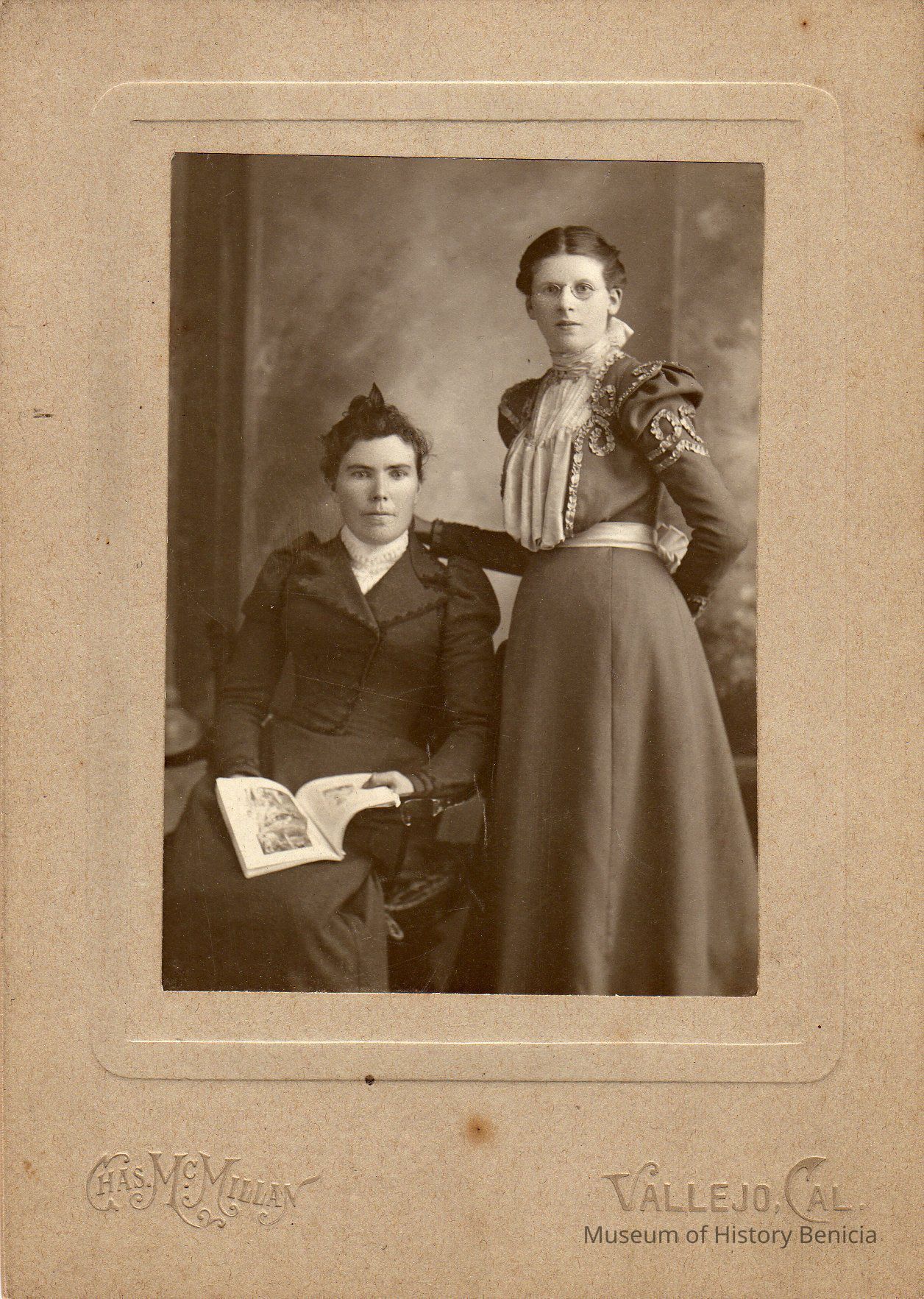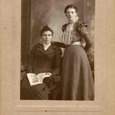 B/W portrait of two unidentified young women. The woman on the right is standing and is wearing glasses. The other is sitting and holds a book.