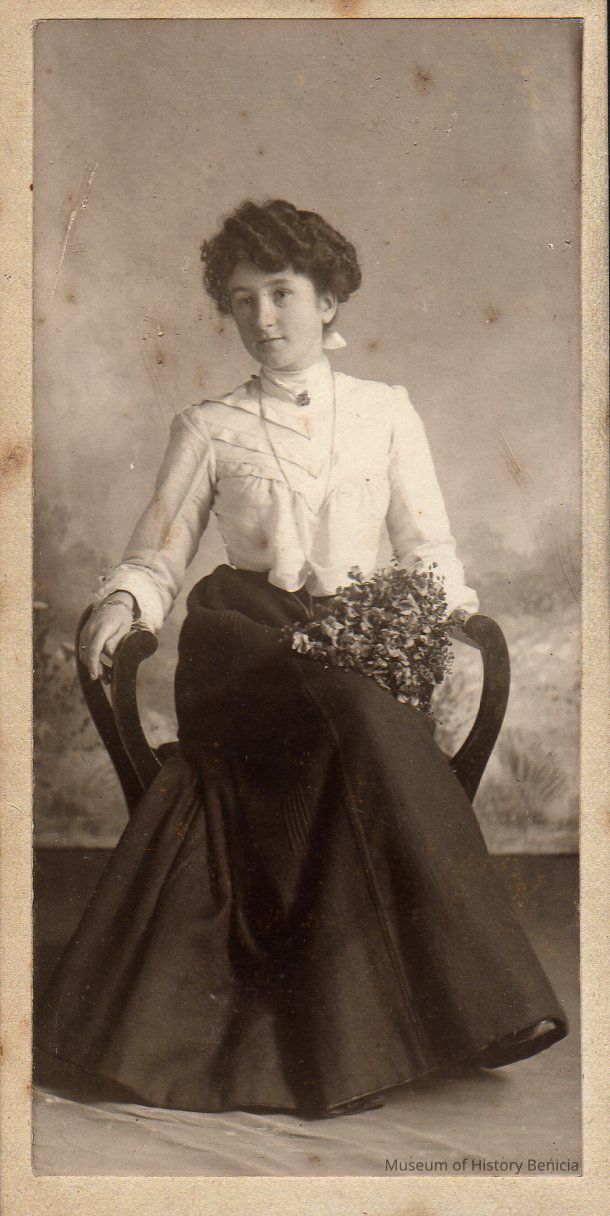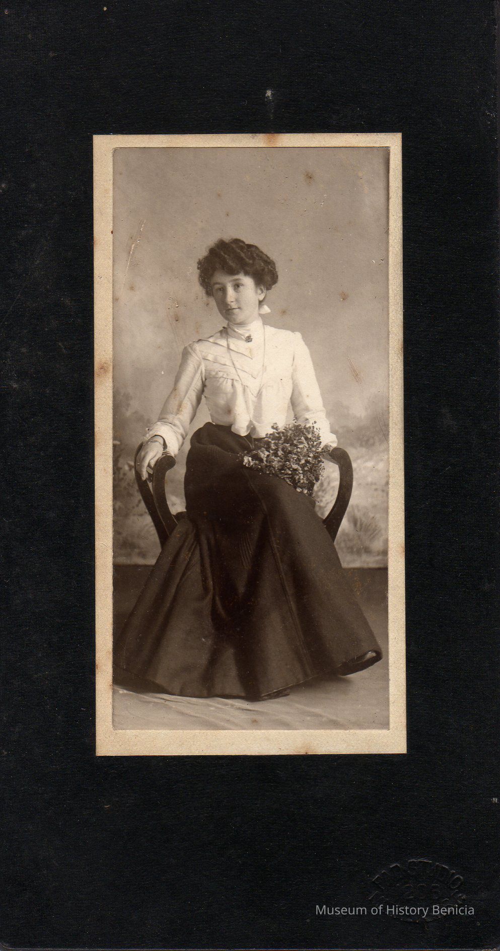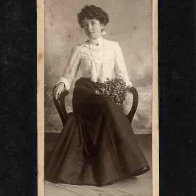 B/W portrait of an unidentified young woman dressed in a long dark skirt and white blouse holding flowers on her lap.