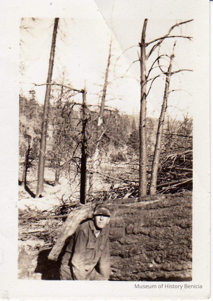 B/W photo of a soldier in a burned forrest. On the back is written Alvo Cavalieri and stamped "Ray Costa"