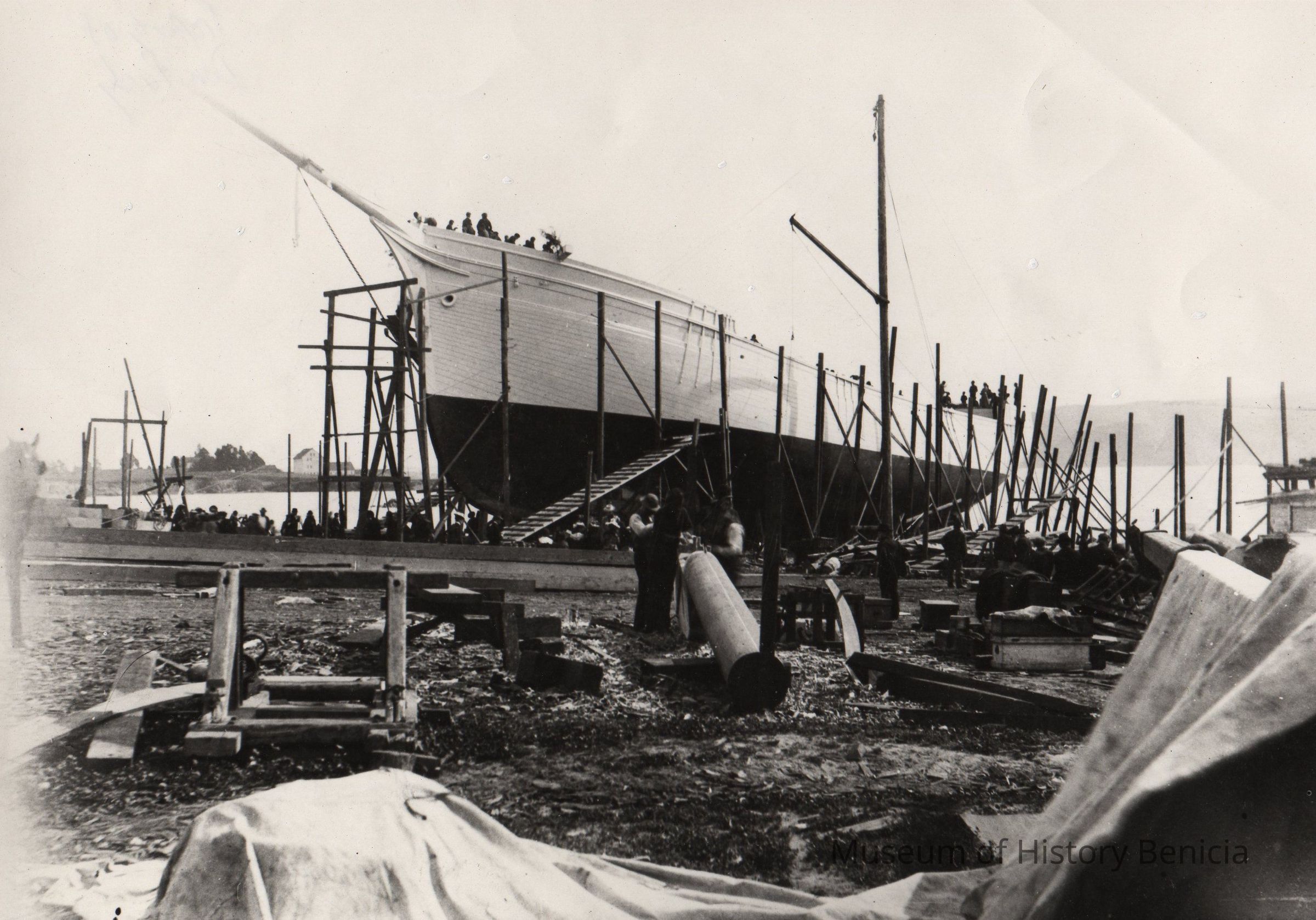 B/W Photograph: shows the Schooner Solano nearing completion at the Matthew Turner Shipyard in 1901.