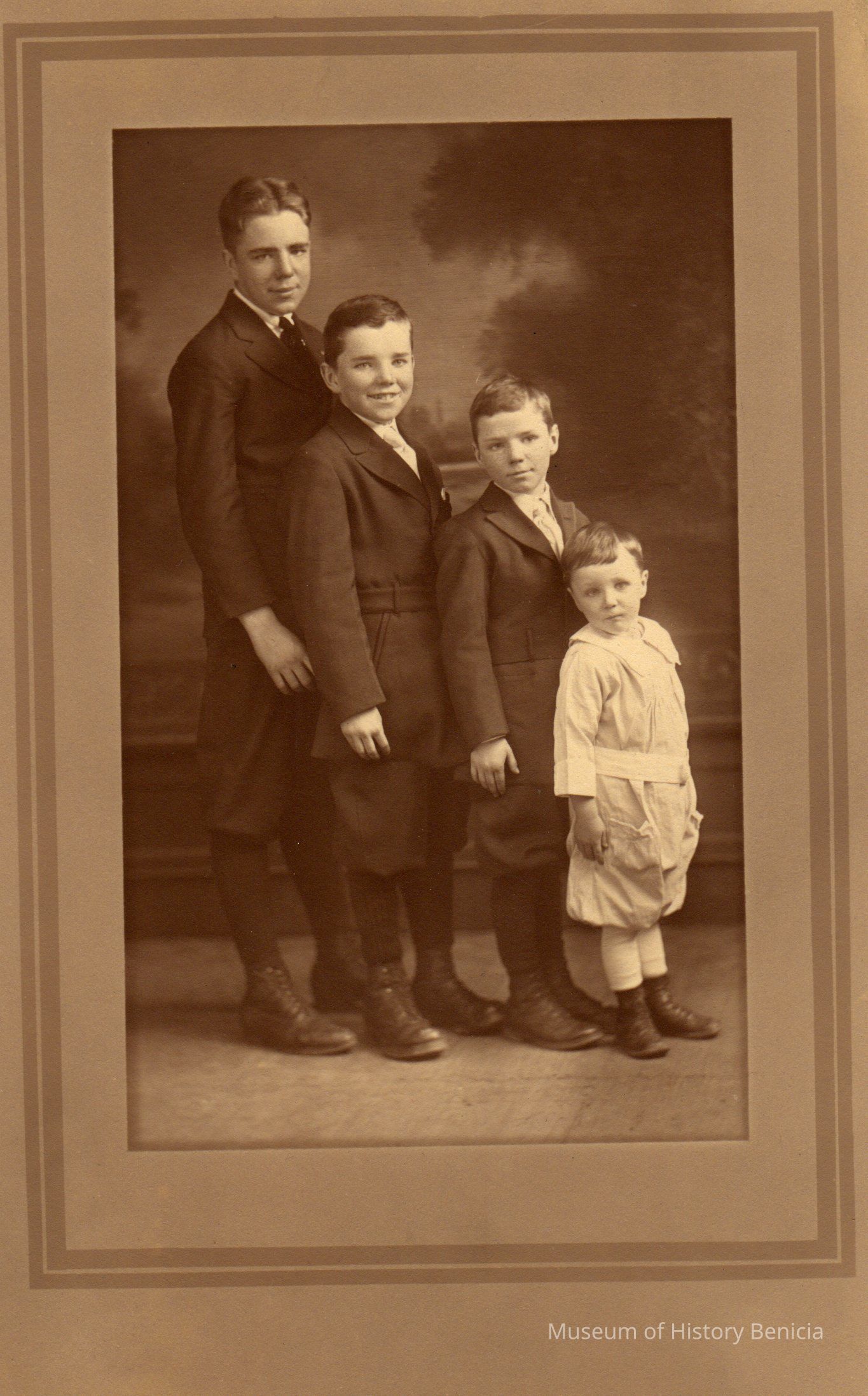 B/W portrait of four boys standing in descending order according to their height.