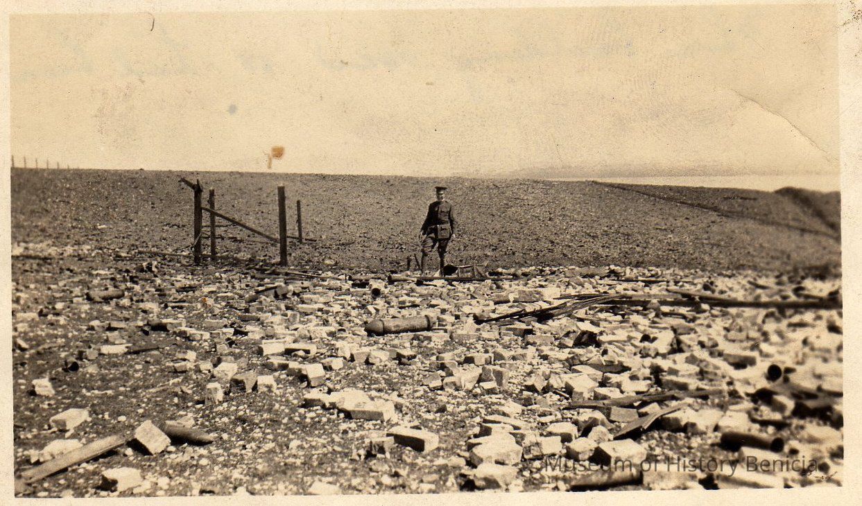 B/W photograph: soldier standing amid rubble of Magazine 11, destroyed by explosion and fire of 1922. on back: "Where buiding was or had been"Collection