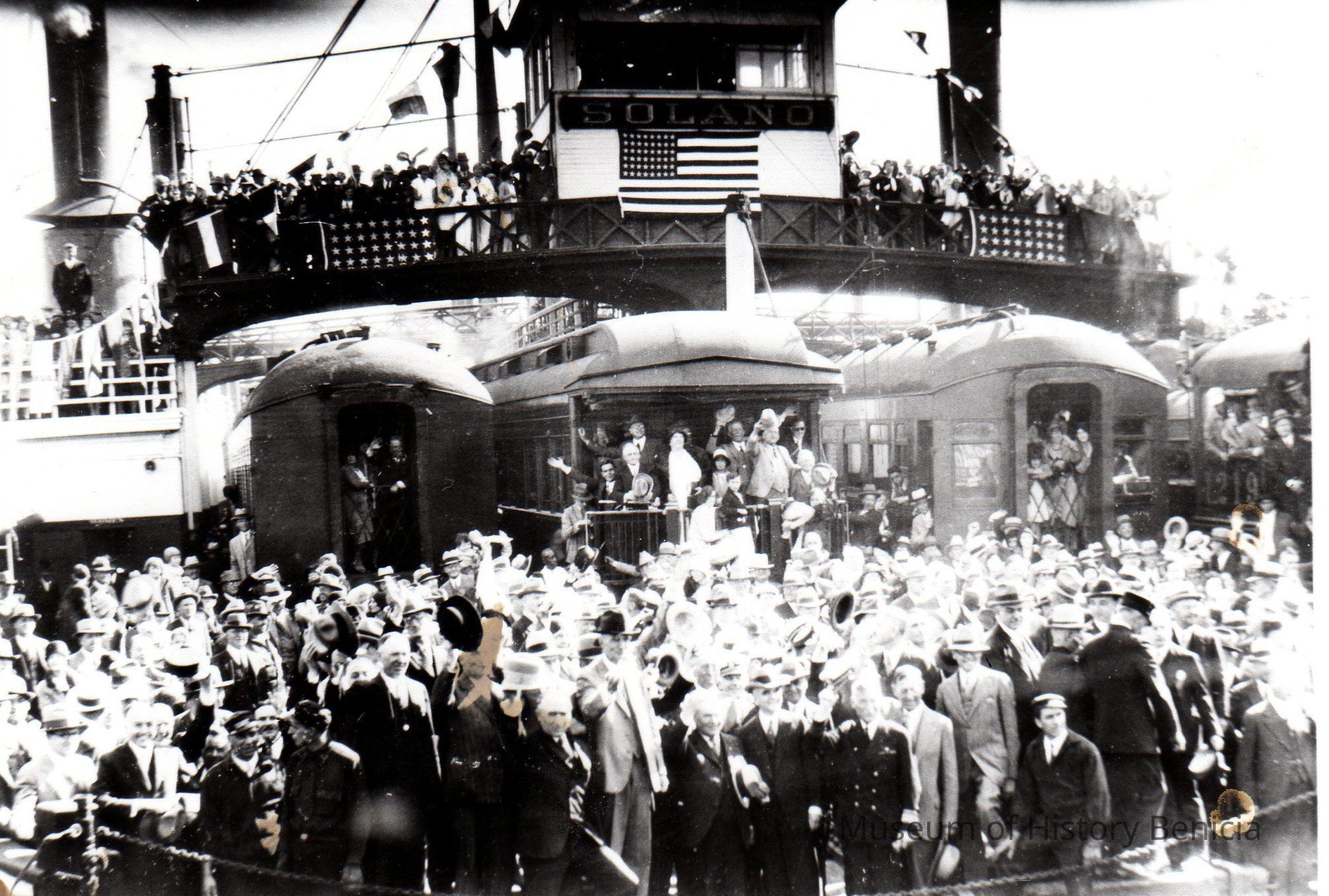 B/W Photograph: large group of people on the ferry "Solano"; this appears to be the last trip across the straits for the big boat