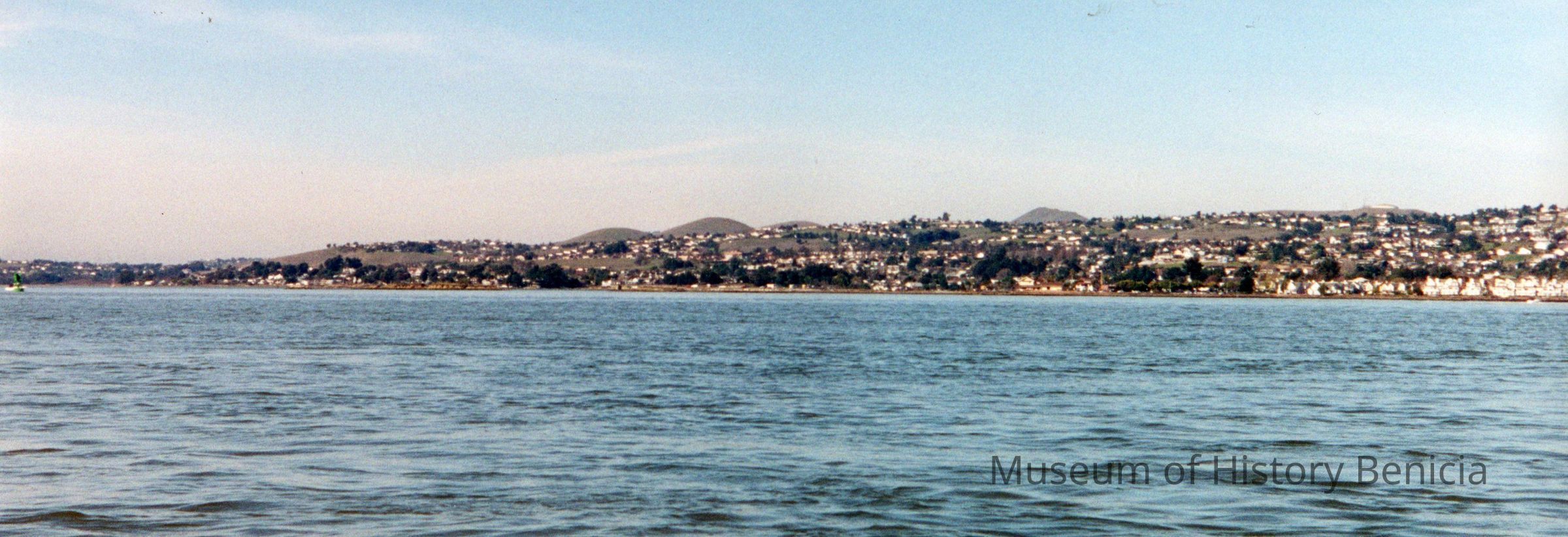 Color photograph. Panoramic view of houses the scattered across the hills along the Straits. Benicia(?)