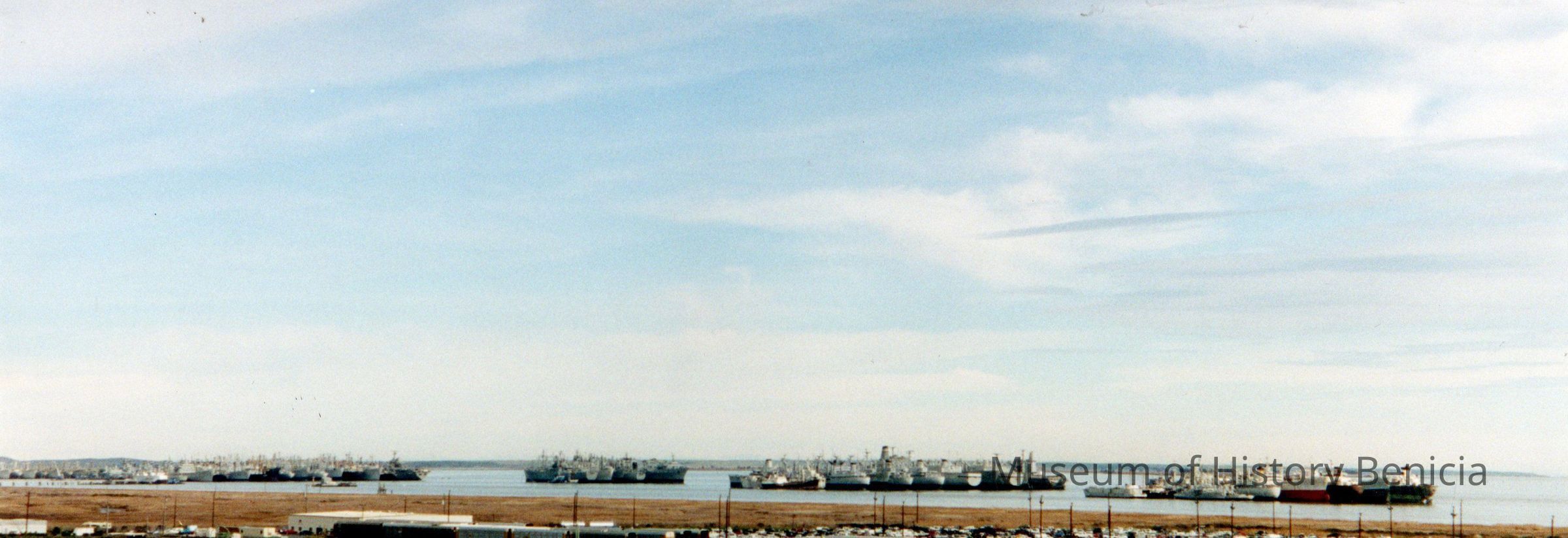 Color photograph. Panoramic view of five rows of the mothball fleet