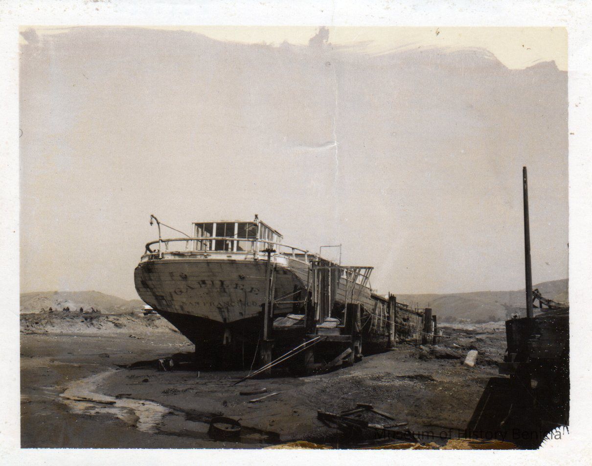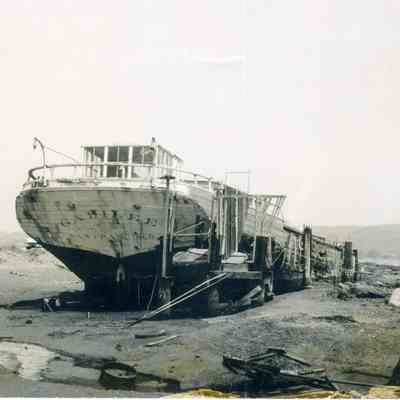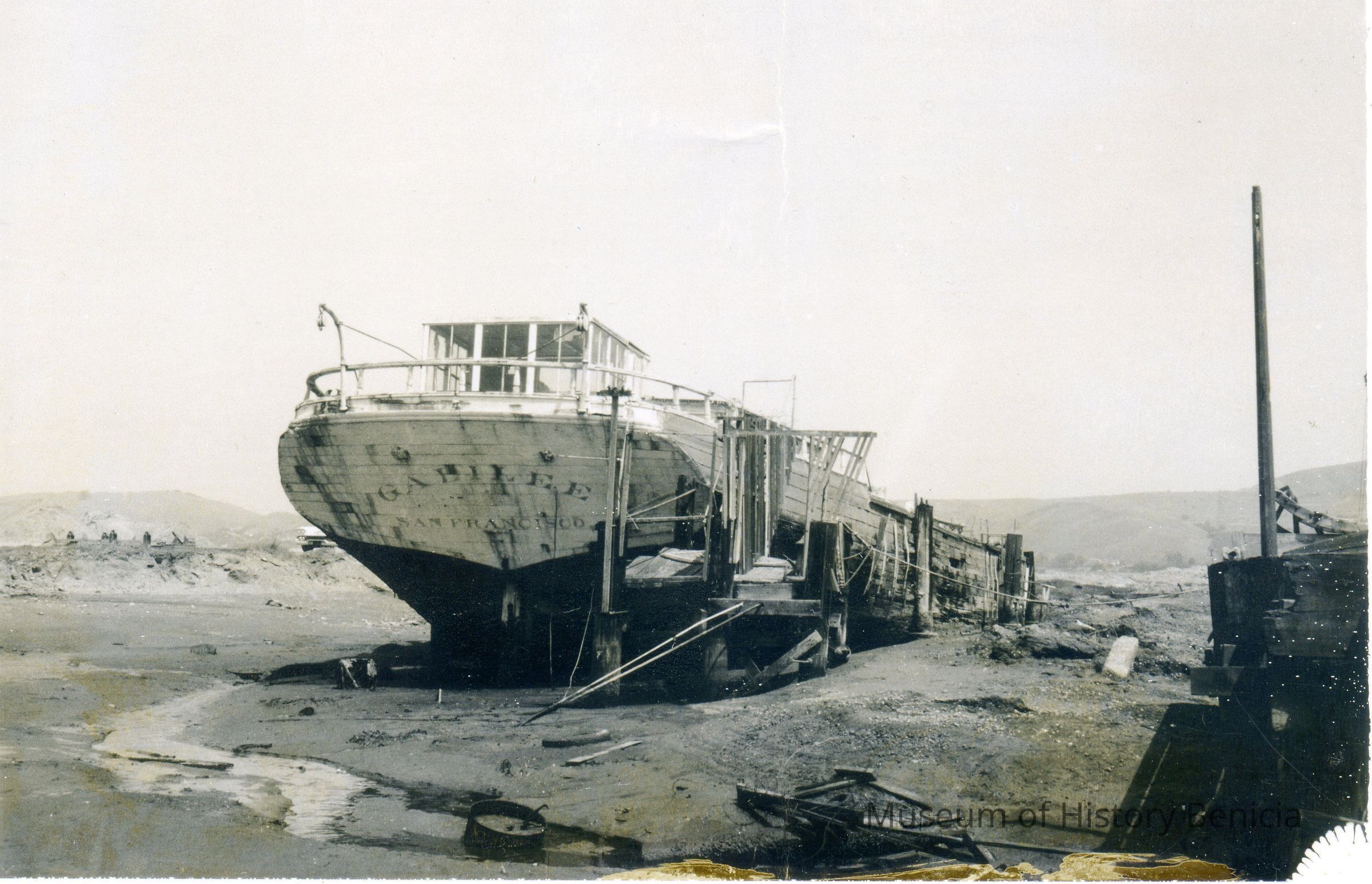 B/W photograph of the Galilee stern in the mud of Sausalito. The ship was still in one piece at this point.