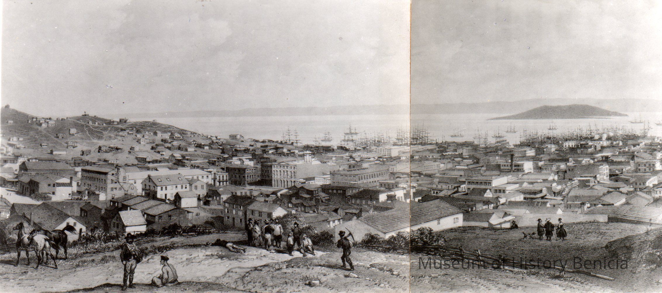 B/W Drawing of San Francisco and Bay circa 1850