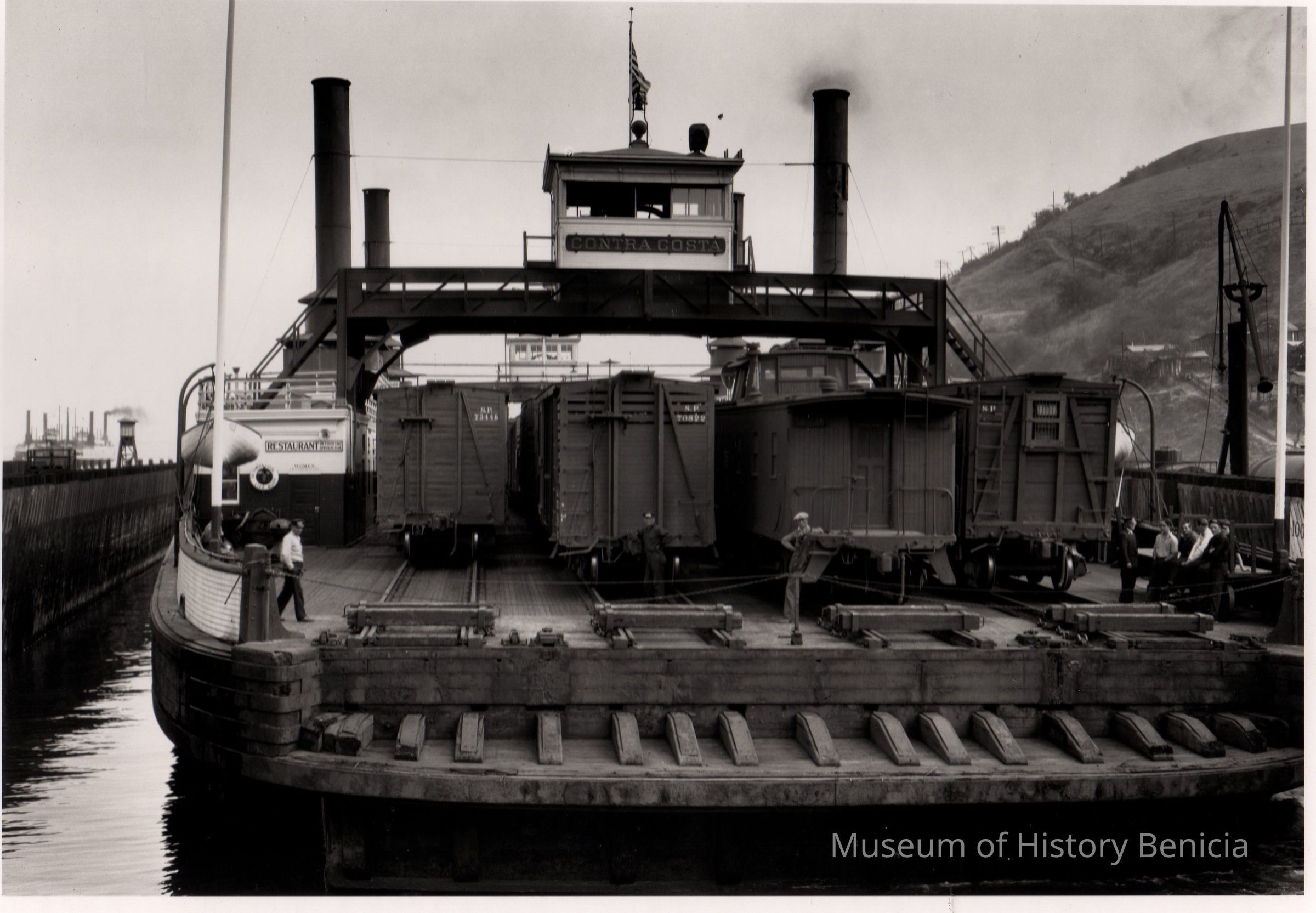 B/W Photograph: on the reverse side of the original photograph: "ferry CONTRA COSTA at Port Costa in 1928, loaded with freight train which will be unloaded at Benicia. " also on back: "Please credit San Francisco Maritime Museum, Ernest D. Wichels collection."Collection