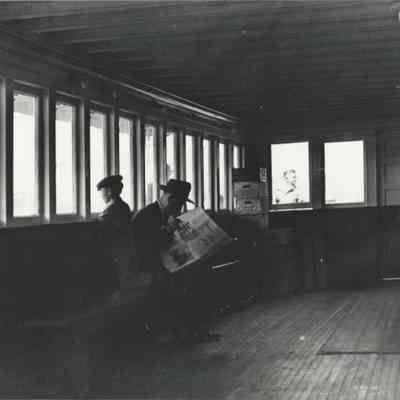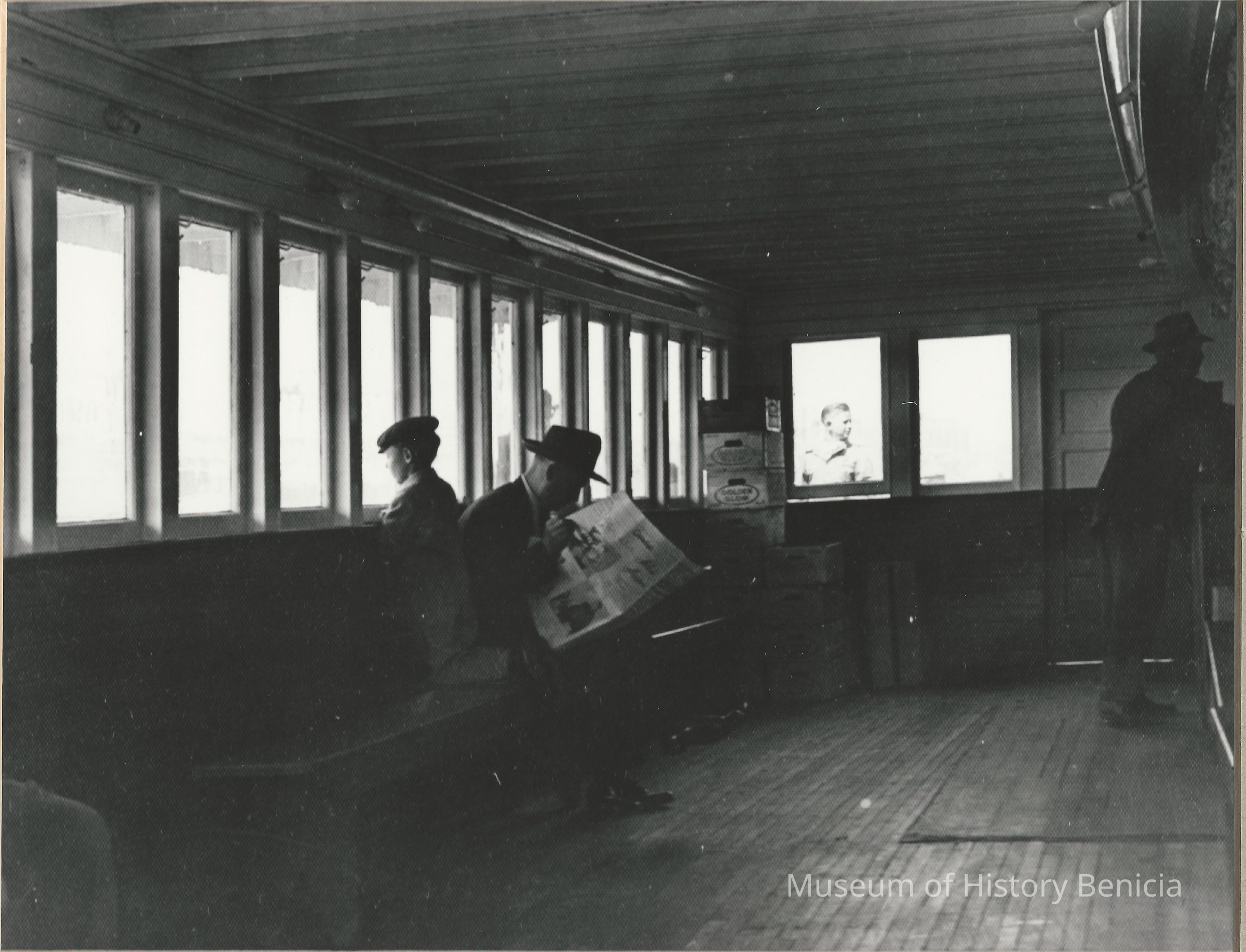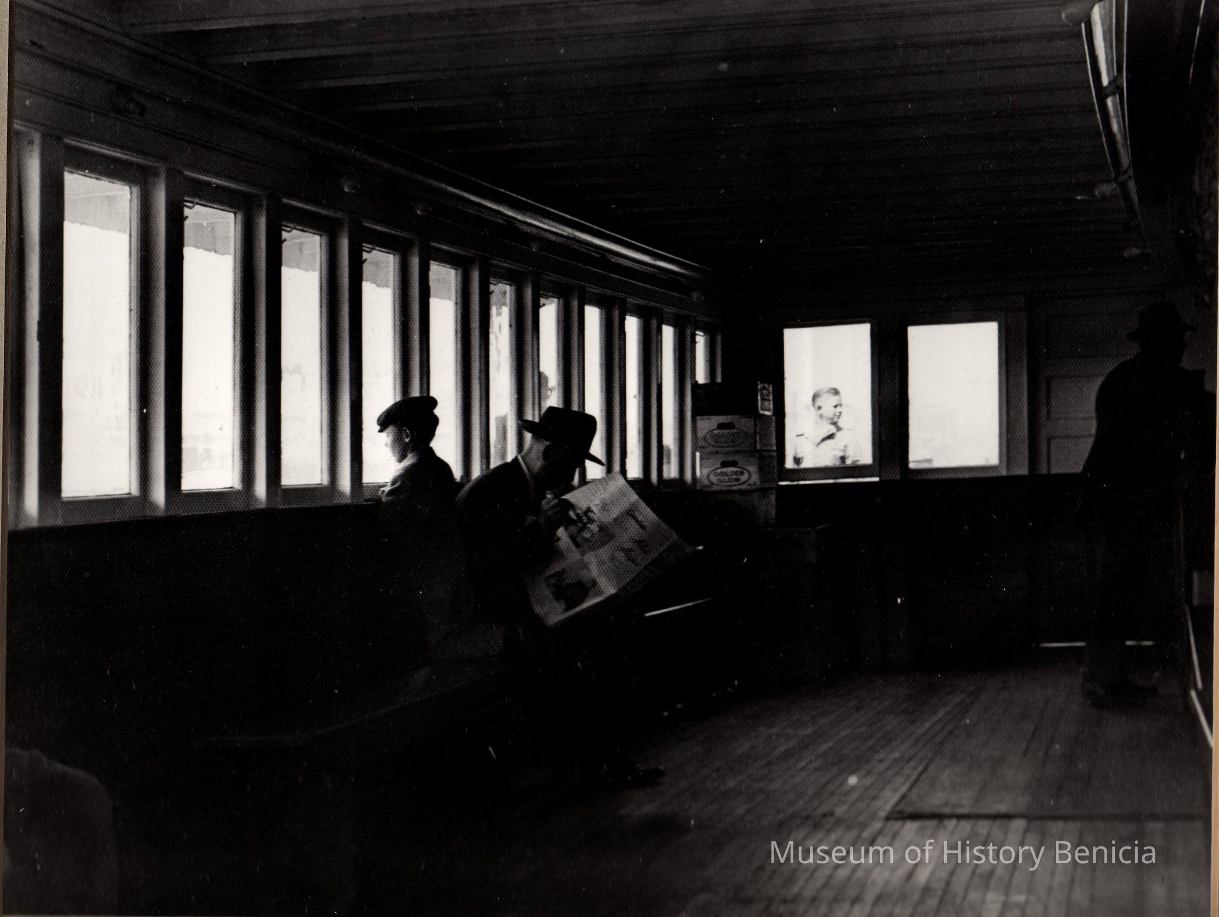 B/W Photograph of passengers on a ferry boat; a man reading a newspaper is next to a young boy who is kneeling looking out the window. Two other men can be seen, one inside and one outside (through the window).