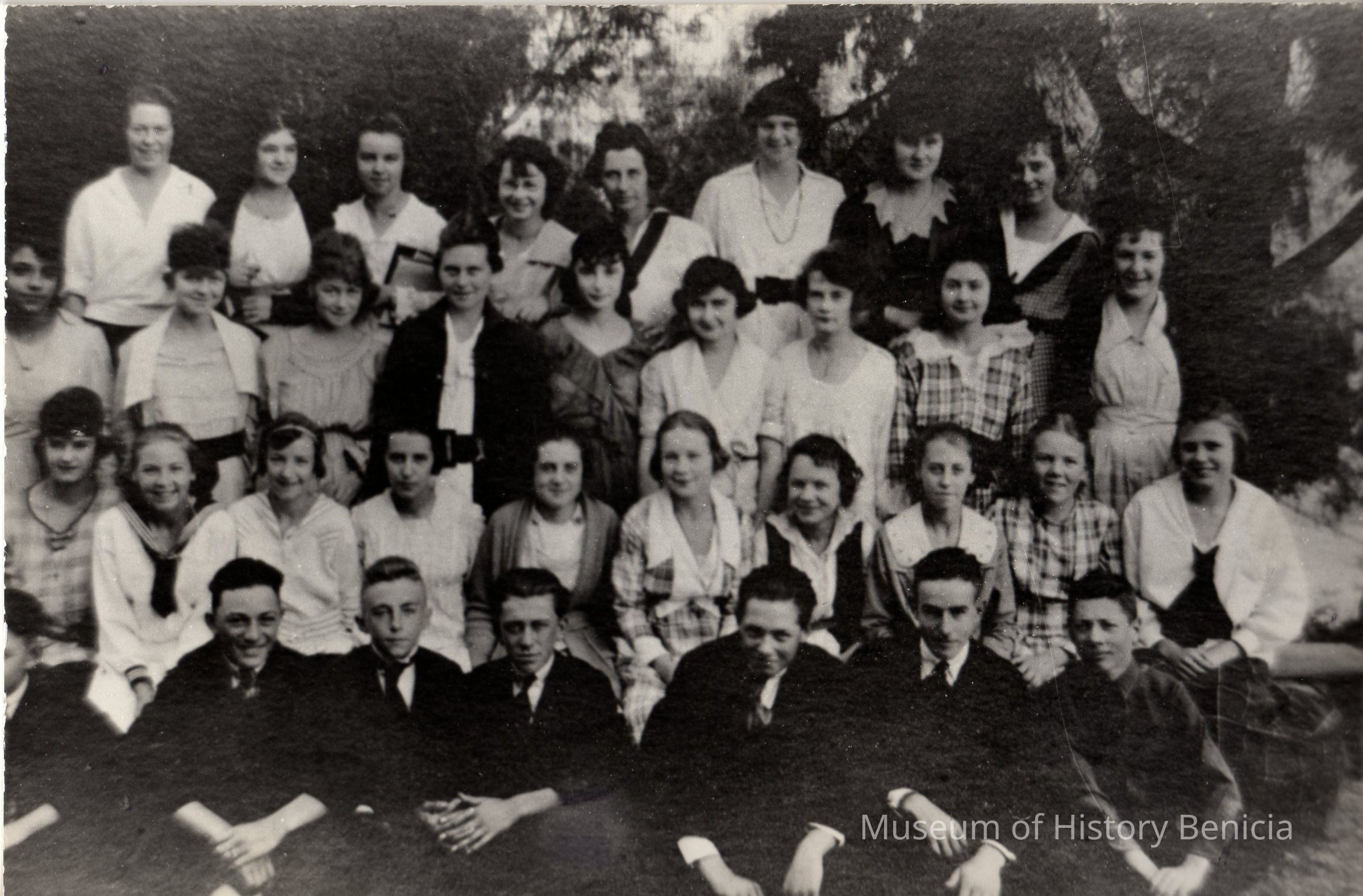 Student body photo, Benicia High School, 1919-20. 34 students included in photo. The names are on the back: Top Row: Helen O'Grady, Margaret Molfino, Margaret Dyer, Inez Pooler, Ruth Allison, Bernice Owens, Irma Christie, Gertrude Gerrish, Third Row: Augusta Rossi, Bernice Wilson, Ina Wagner, Margaret (Jacky) Johns, Hazel Brown, Muriel McConlogue, Frances Wilson, Agnes Walsh, Marian White, Second Row: Evelyn Wilson, Viola Petersen, Jean Jarvis, Eve Siqueria, Marie Holland, Hortense Hiller, Ruth Honey, Loretta Fay, Roma Kline, Florence Clymo, First Row: Cyril House, Minor Silvey, Edward Fay, Edward Cardoza, Lawrence Ritchie, Richard Maurer, Stewart Gray.Collection