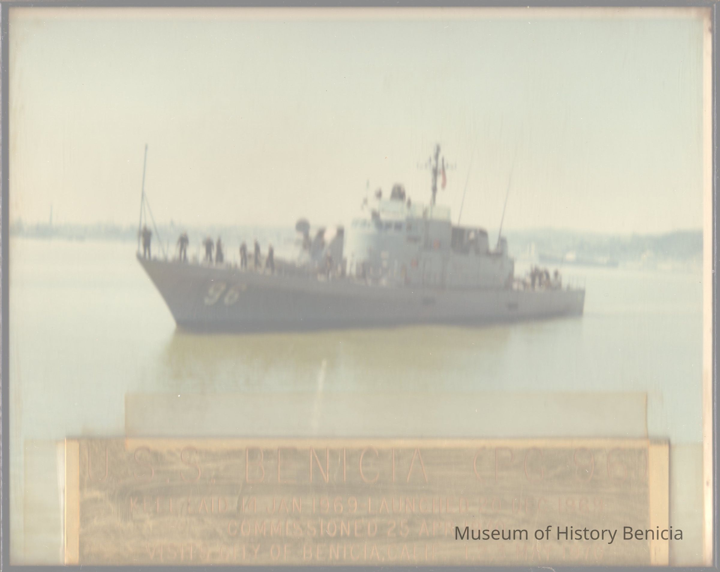 a brass plate is attached to the front of the glass below the ship's photo. It reads: U.S.S. Benicia (PG 96) Keel laid 14 Jan 1969 - Launched 20 Dec 1969 Commissioned 25 Apr 1970 Visits City of Benicia, Calif. 1,2,3 May 1970. The ship was leased to South Korea from 1971-1991. In 1996 the ship was scrapped.Collection
