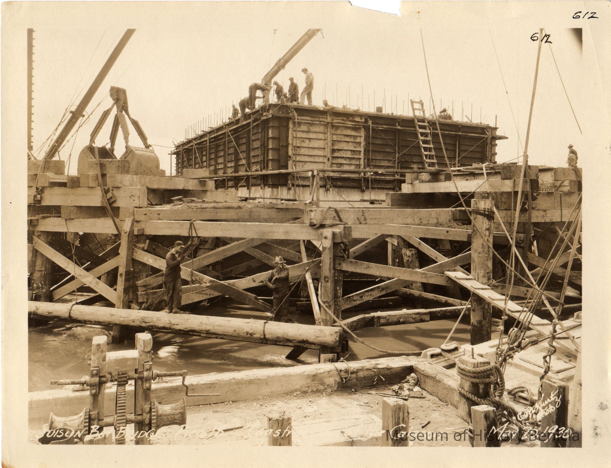 Sepia toned photograph of the Suisun Bay Bridge pier 18 during construction for the Southern Pacific Company that spans between Martinez and Benicia. Note the man smoking a cigarette in the middle of the photo. May 20, 1930Collection
