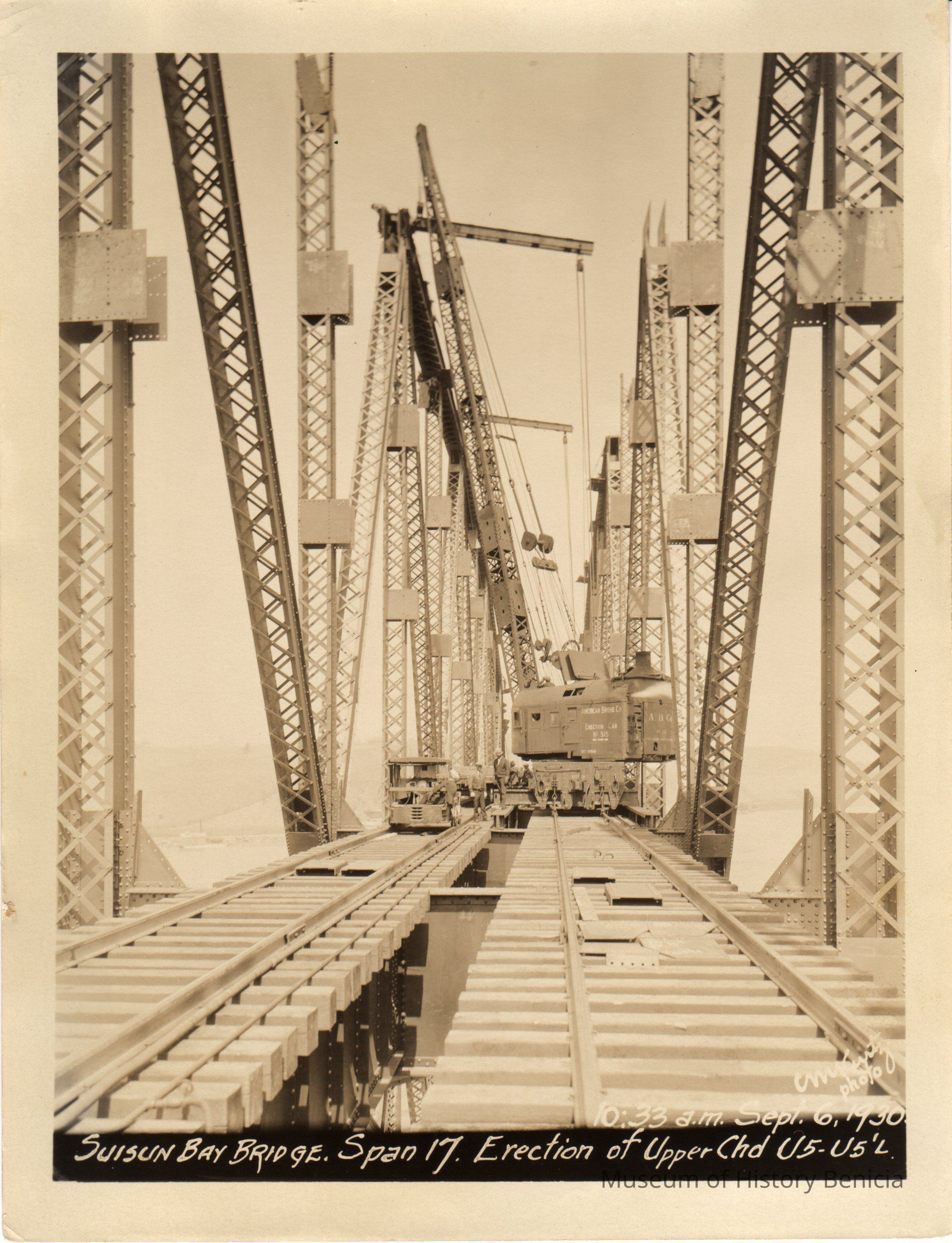 Sepia toned photograph of the Suisun Bay Bridge Span 17 erection of upper chord. Bridge spans between Martinez and Benicia. Time 10:33 a.m. on September 6, 1930. Bridge built by the Southern Pacific CompanyCollection