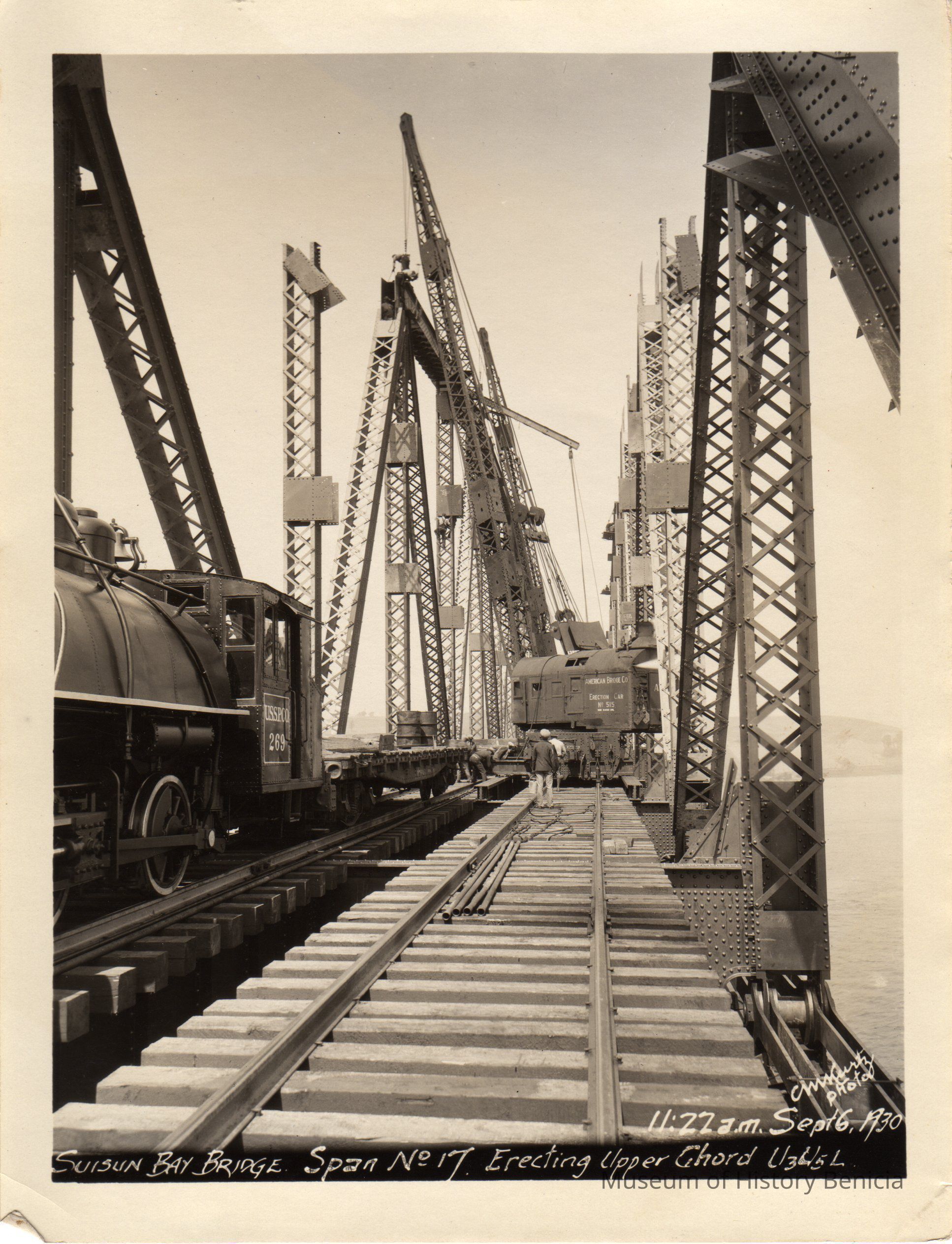 Sepia toned photograph of the Suisun Bay Bridge Span 17 erection of upper chord. Bridge spans between Martinez and Benicia. Time 11:22 a.m. on September 6, 1930. Bridge built by the Southern Pacific CompanyCollection