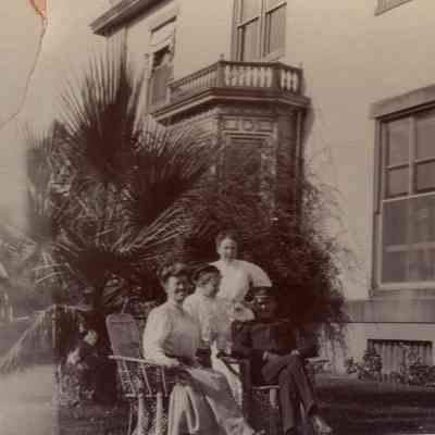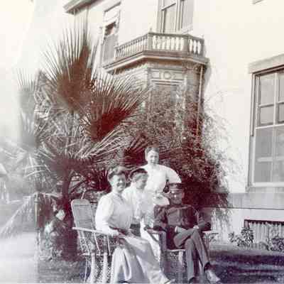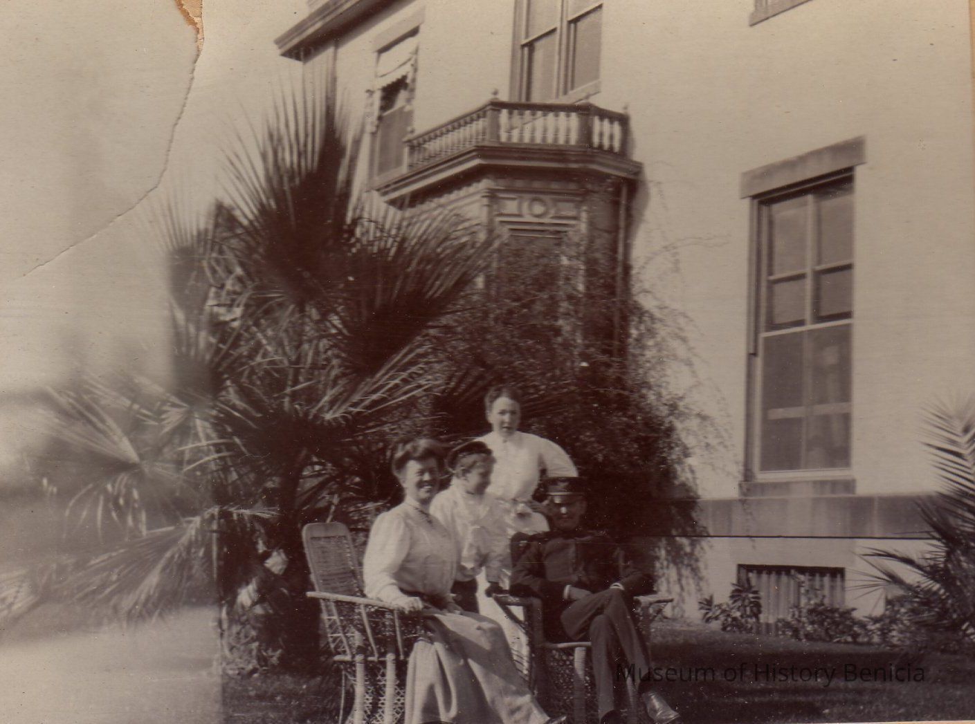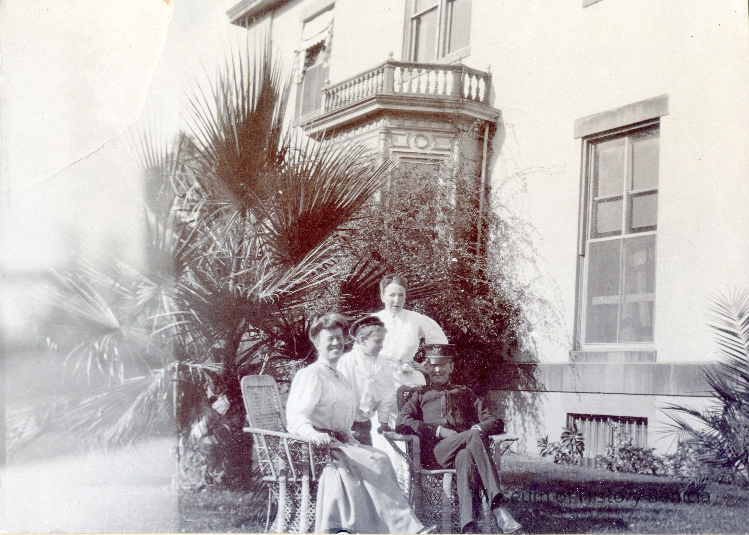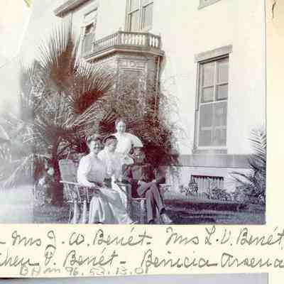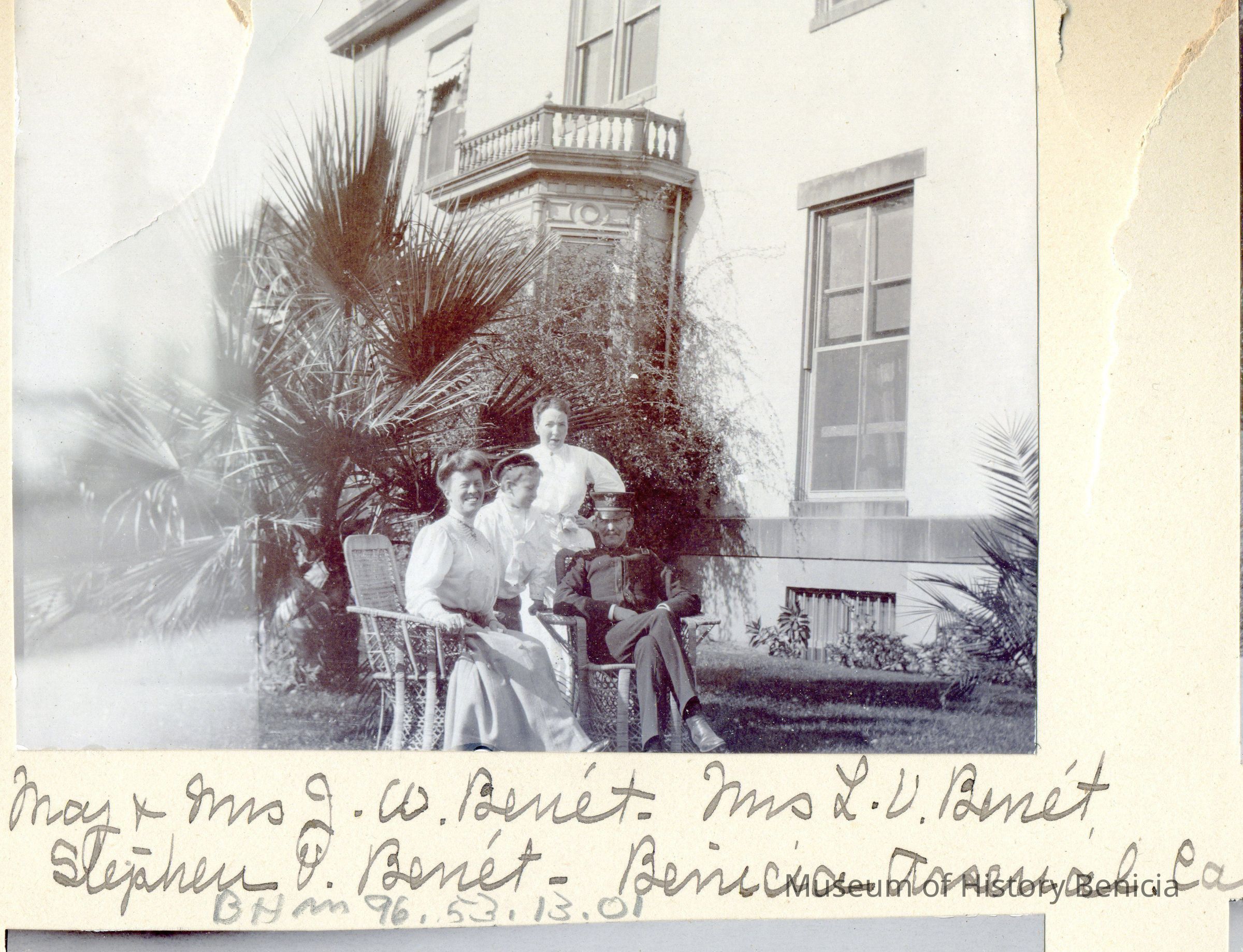 B/W photograph on white album paper: written below picture #1: "Maj & Mrs J W Benet, Mrs L V Benet, Stephen V Benet Benicia Arsenal Cal Oct 1906" ; the Commandant's home is in the background.Collection
