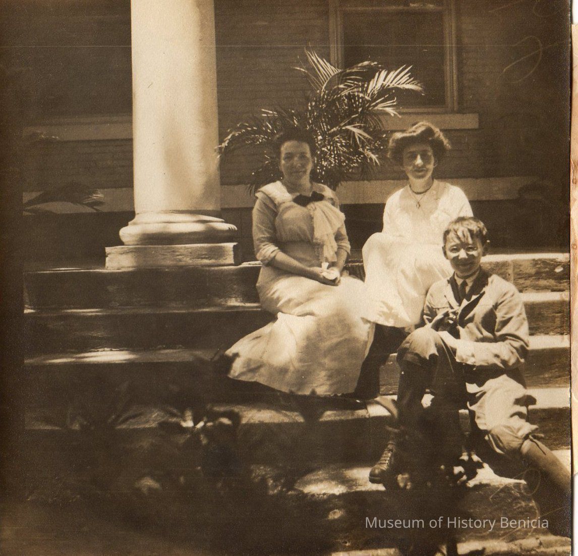 B/W photograph on white paper: Laura and Stephen Vincent Benet and an unidentified woman sitting on stairs of a large home (might possibly be in Augusta, GA?).