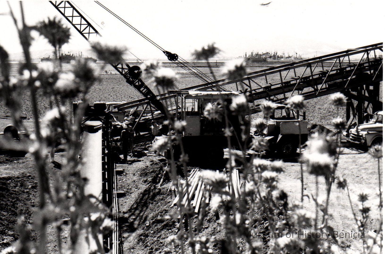 B/W Photograph: Industrial Park shore, east of Benicia Bridge; looking through weeds in foreground towards loader and crane in background.