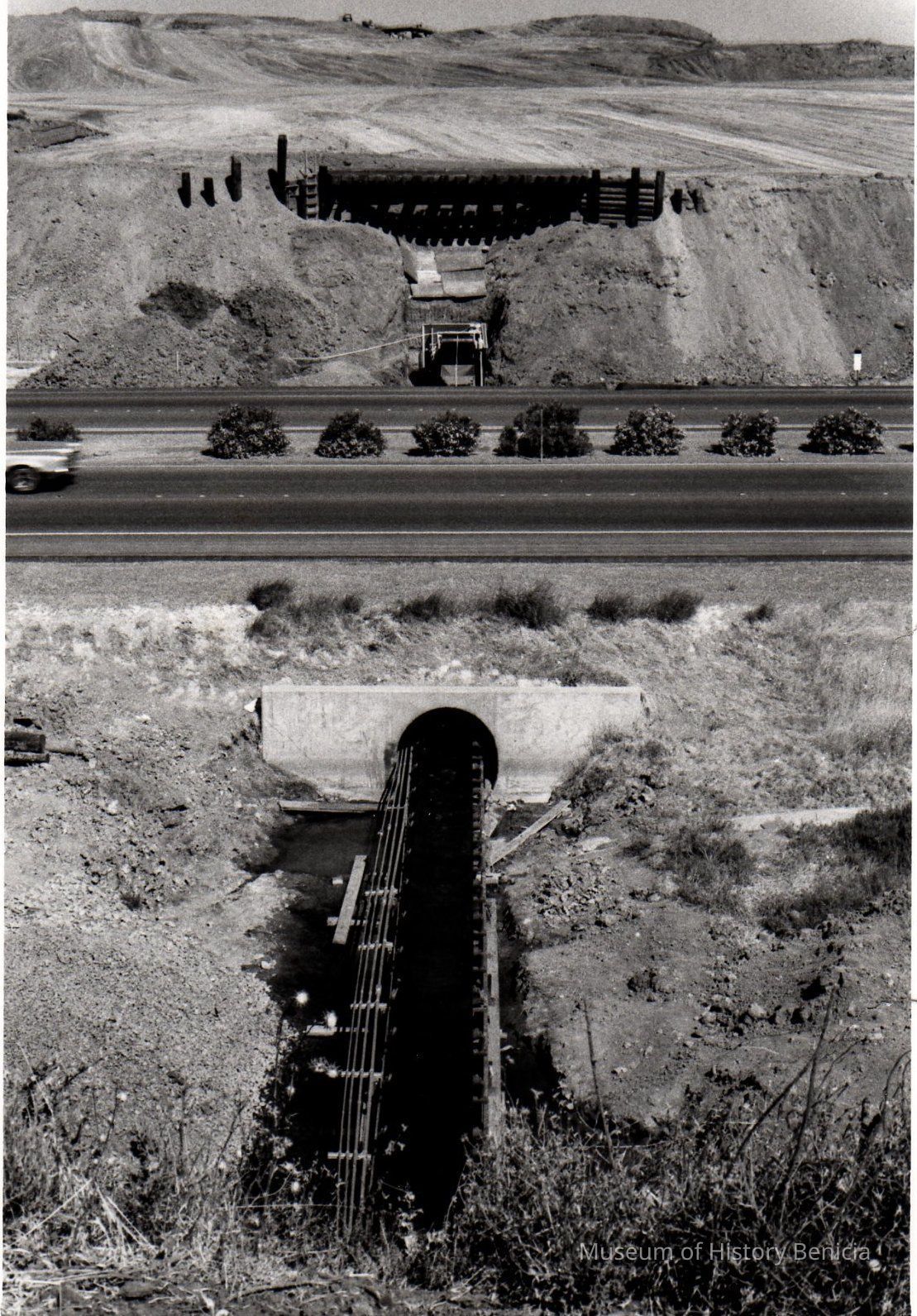 B/W Photograph: Industrial Park shore, east of Benicia Bridge; shows converyor belt under the freeway probably taken from the loader platform.