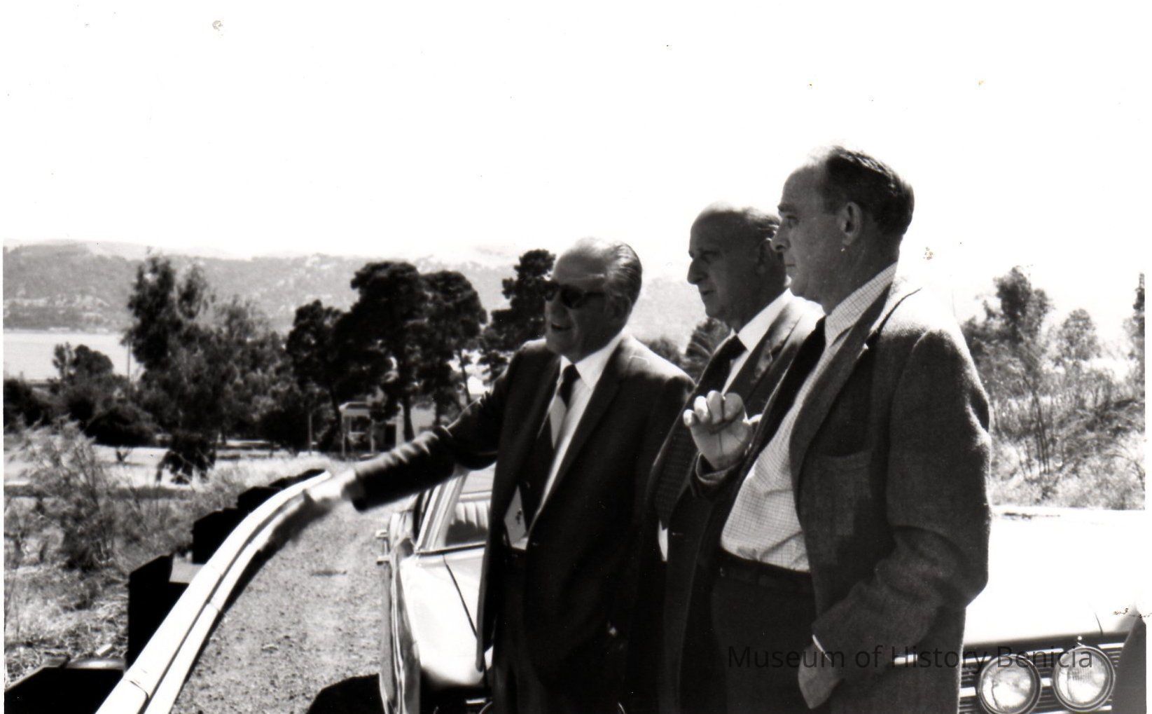 B/W photograph of three unidentified men visiting a construction site in the Benicia Industrial Park one of a set of 8