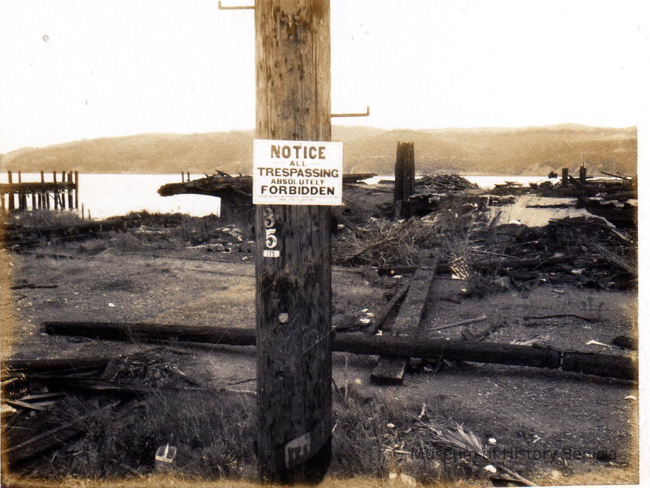 B/W photograph showing area at the end of First Street where old cannery ruins were present. Now the location of the Benicia Marina. "No Trespassing" sign on pole in foreground.