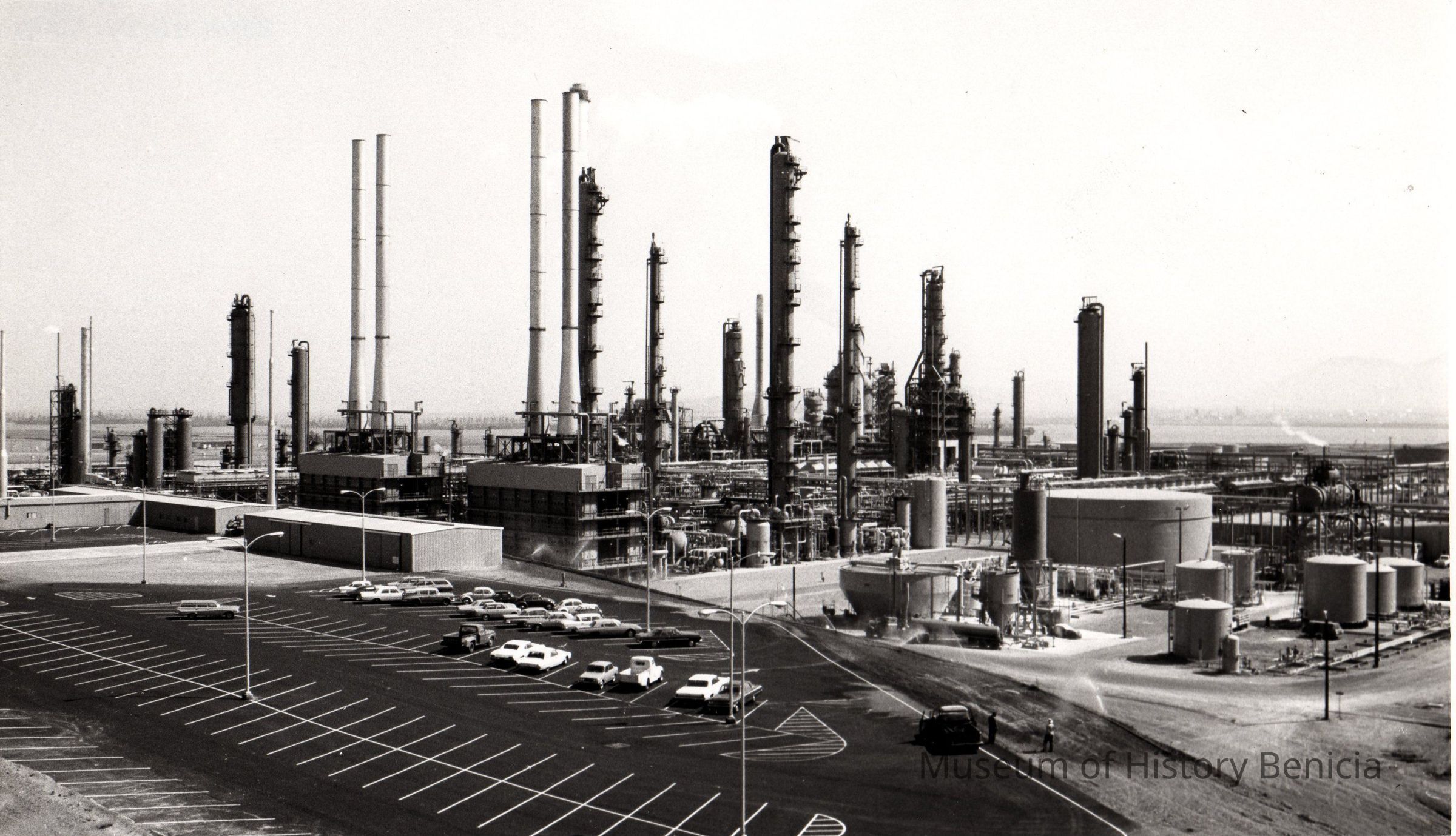 B/W photograph: shot of refinery with parking lot near refinery equipment. Straits and Mothball Fleet in background.