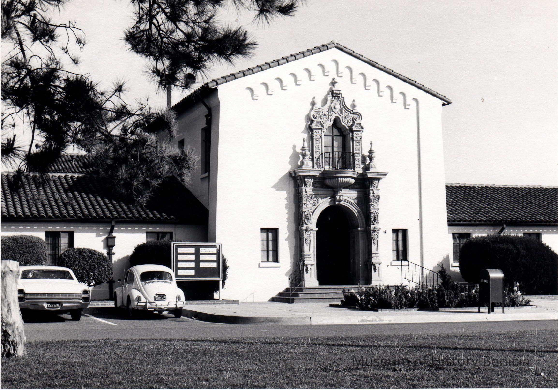 B/W photograph Benicia Arsenal Headquarters Building, built in 1940. View is a close up of the entrance to the building
