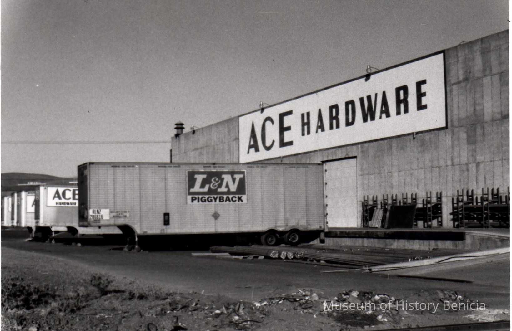 B/W Photograph: one of a set of ten showing the building of a warehouse building of Ace Hardware in the Benicia Industrial Park or of the completed building with truck trailers lined up by the loading dock.Collection
