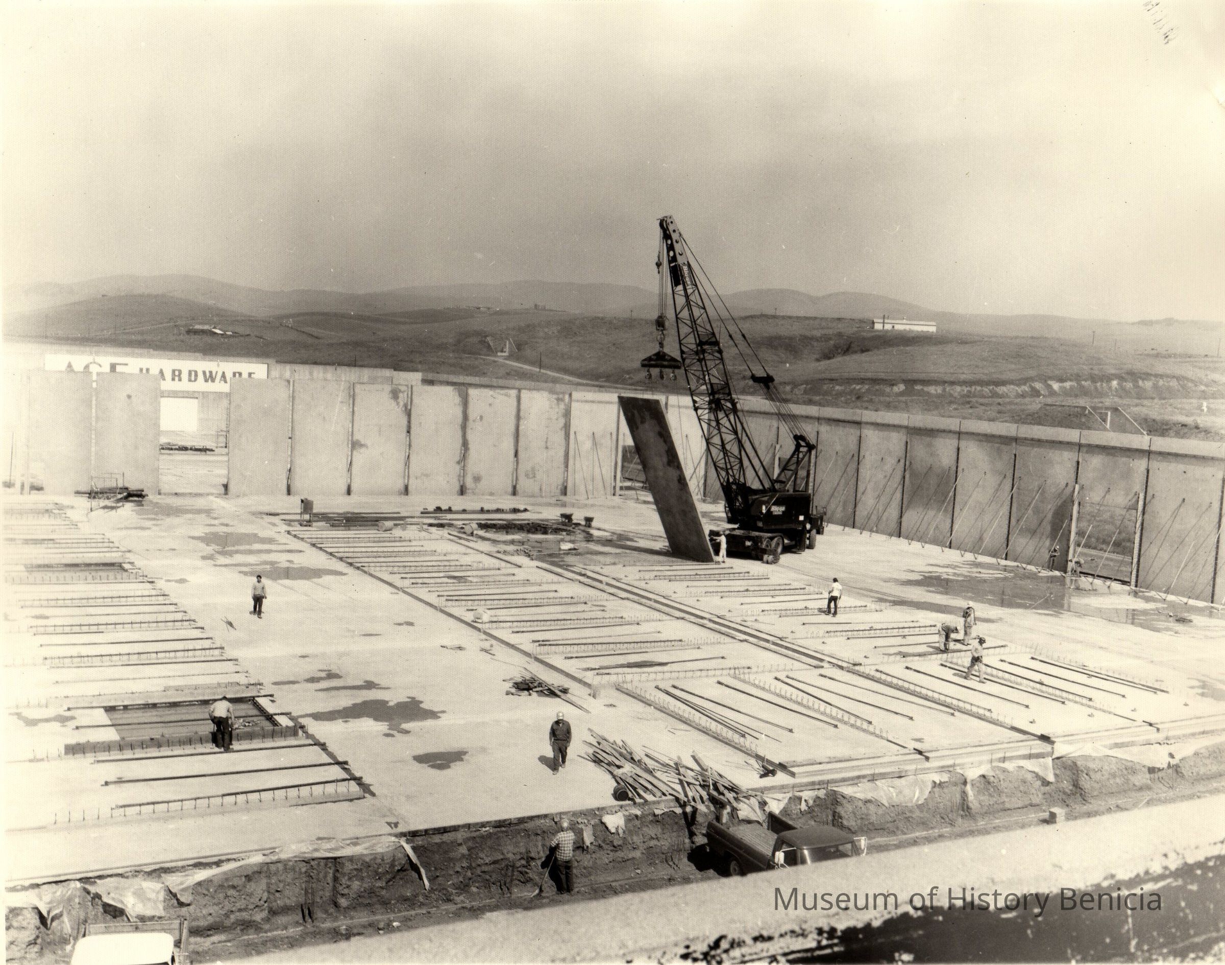 B/W Photograph: one of a set of ten showing the building of a warehouse building of Ace Hardware in the Benicia Industrial Park. A large crane is moving in a section of the wall of the building.Collection
