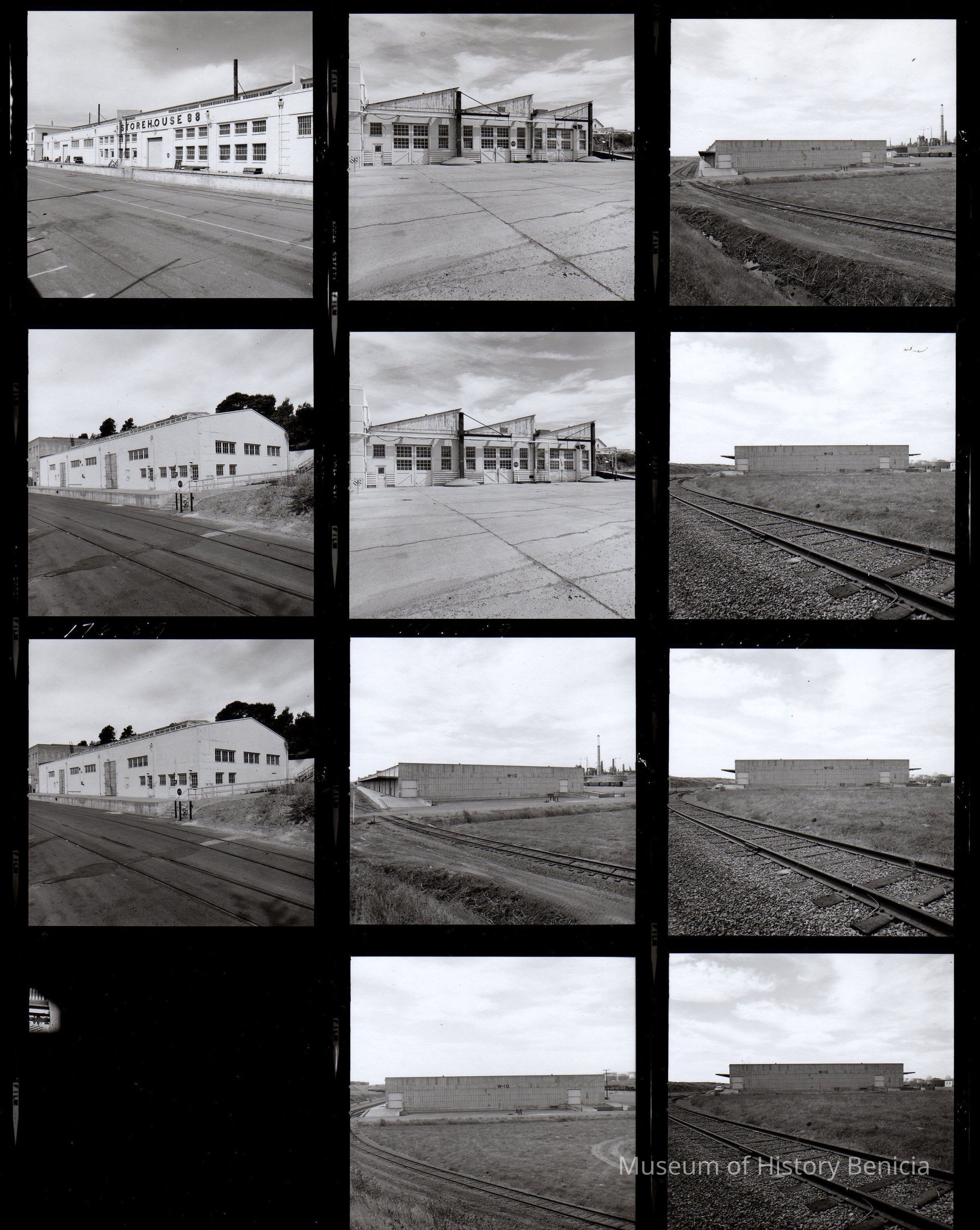 B/W contact prints: one of a set of seven showing Benicia Arsenal buildings (interiors and exteriors) when Benicia Industries moved to Industrial Park. (11 - 2.25" x 2.25" prints on page)Collection