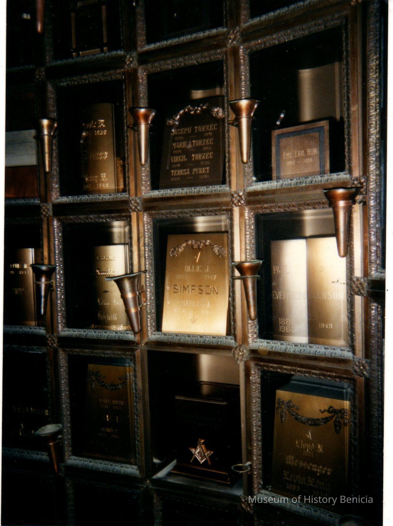 Color photograph of inurnment area (Mausoleum) at Abbey of the Chimes for members of the Masonic lodges.