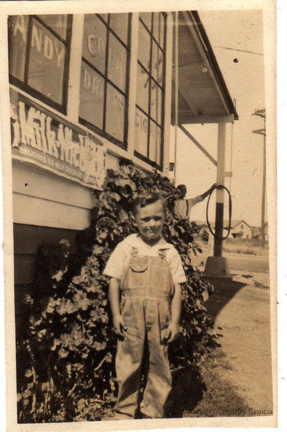 B/W photograph shows a boy (age 5 or 6) in overalls, standing by a building; it could be Simpson's Gas Station and Store (corner of East H and East 5th Streets), lettering can be seen on the windows and an advertising sign is hung beneath the windows (the word "Milk" can be read on the sign). There is also a man standing in the background.Collection
