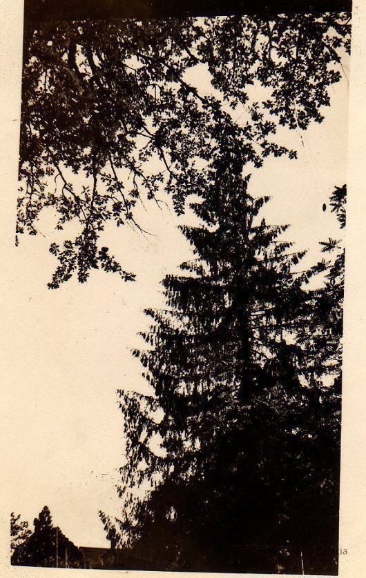 B/W photograph shows a tall pine tree, location is unknown