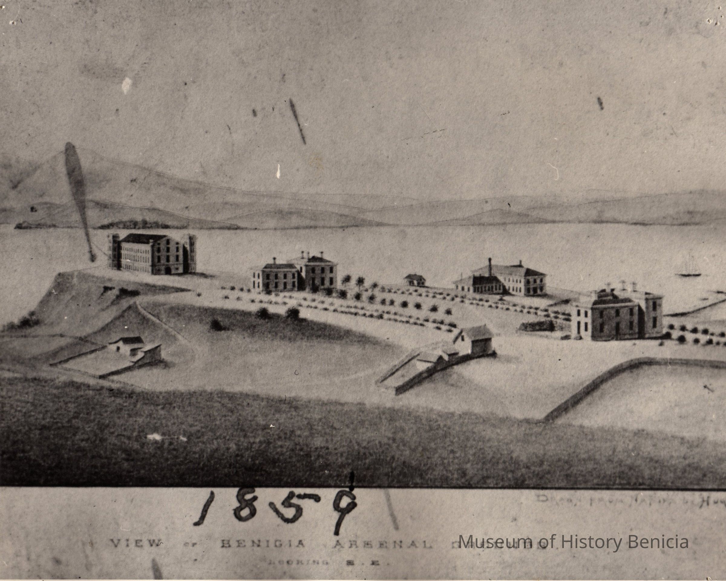 B/W photograph of a lithograph: "View of Benicia Arsenal Grounds Looking S.E." 1859