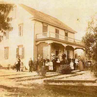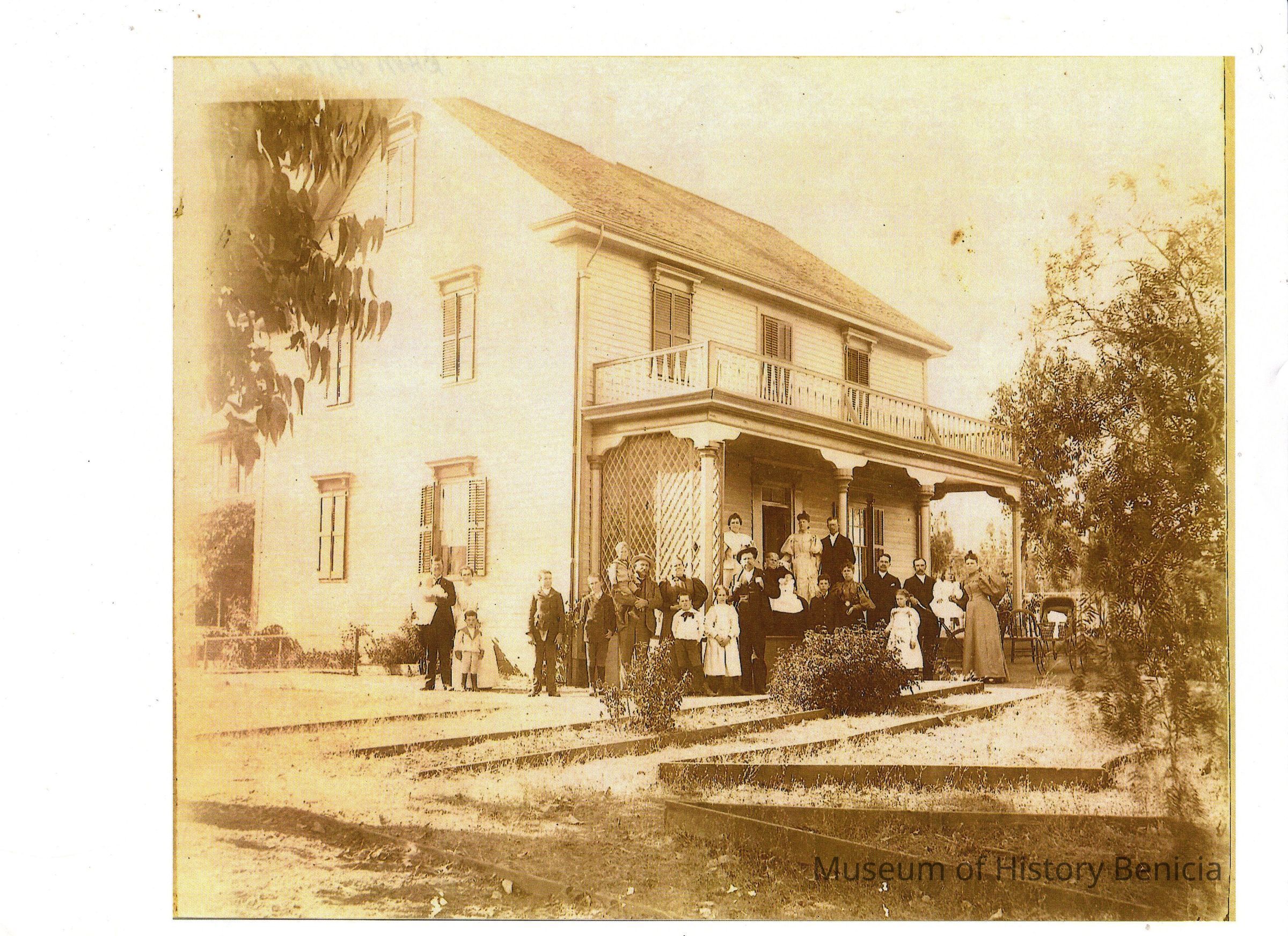 Sepia toned photocopy of home at 280 East J Street. Information from a real estate flyer when the house was sold in 2009: Built in 1850, on .43 acre, legend has it that this home was dismantled in New Hampshire and brought around the horn where it was reconstructed at its present location for Lewis Sanborn. It is also told that Governor Bigler stayed in the home the night before his inauguration for his second term. It is claimed the home has been owned by only 3 families since it was built. In 1955 James O. Milburn bought the home and raised his family there. At time of sale (2009) it had 5 bedrooms and 3 baths and 3,328 sq ft.Collection