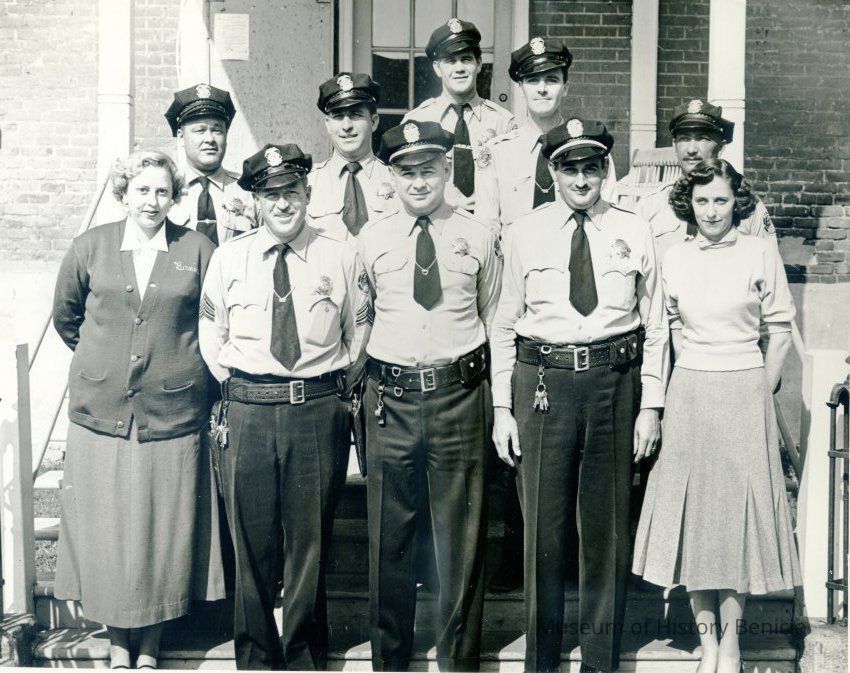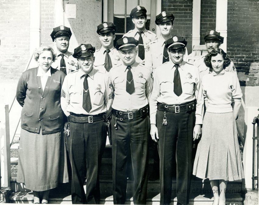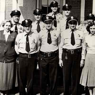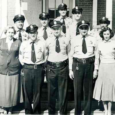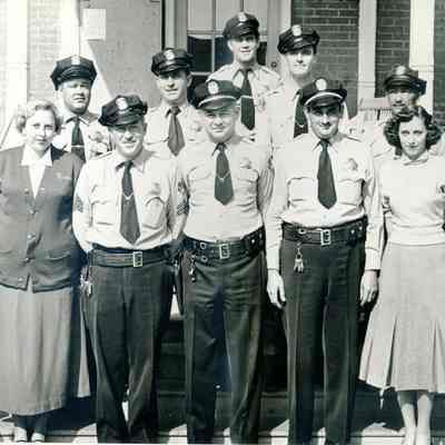 front row: Bernice Reed, radio operator; George Little; Romeo Lavezzo, Chief; Dan Pitta, Margaret Goodwin, police & court clerk;