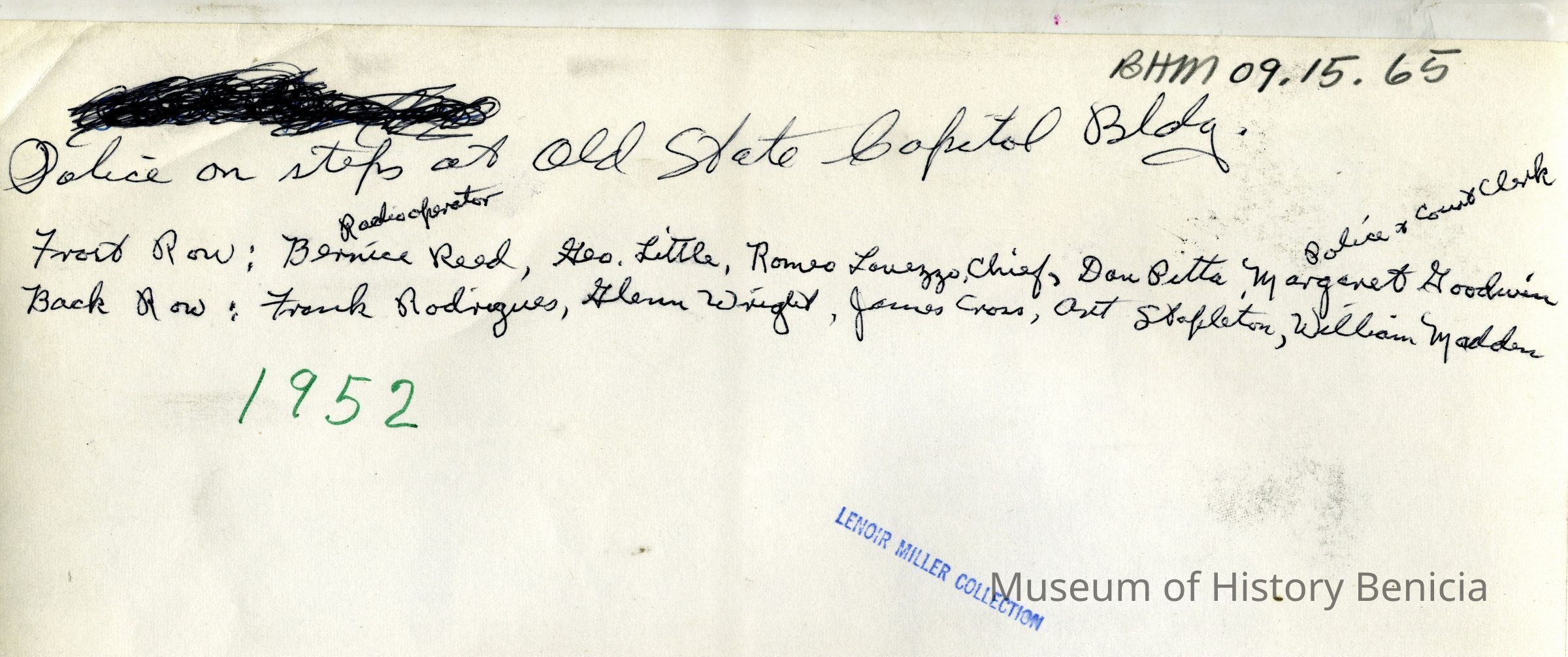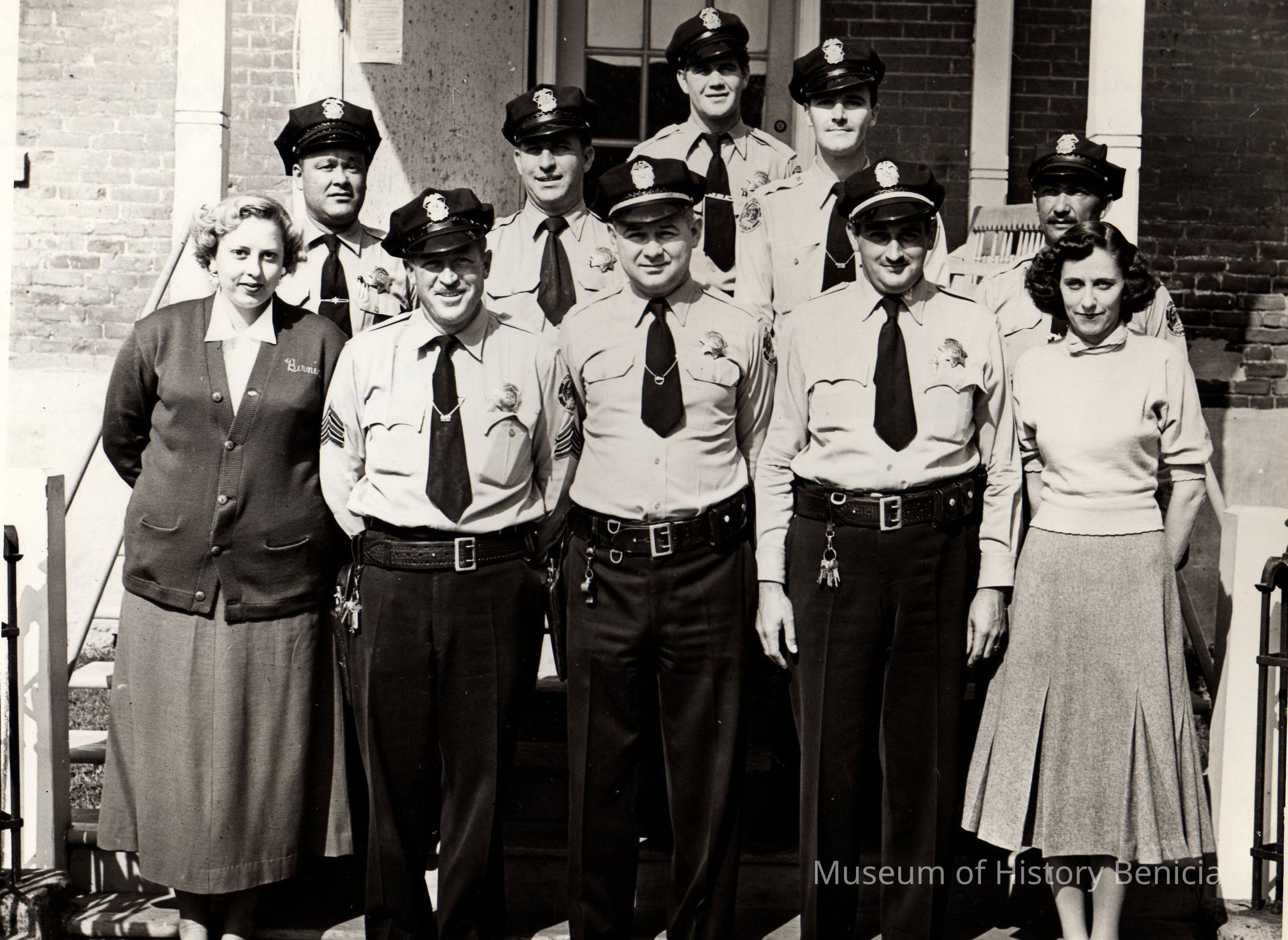 B/W photograph of Benicia Police Dept. members on steps of Capitol Bldg.