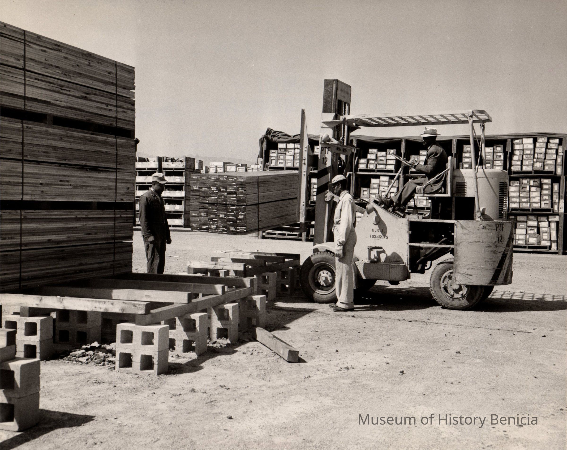 B/W photograph of three African American men working in the Arsenal lumber storage area
