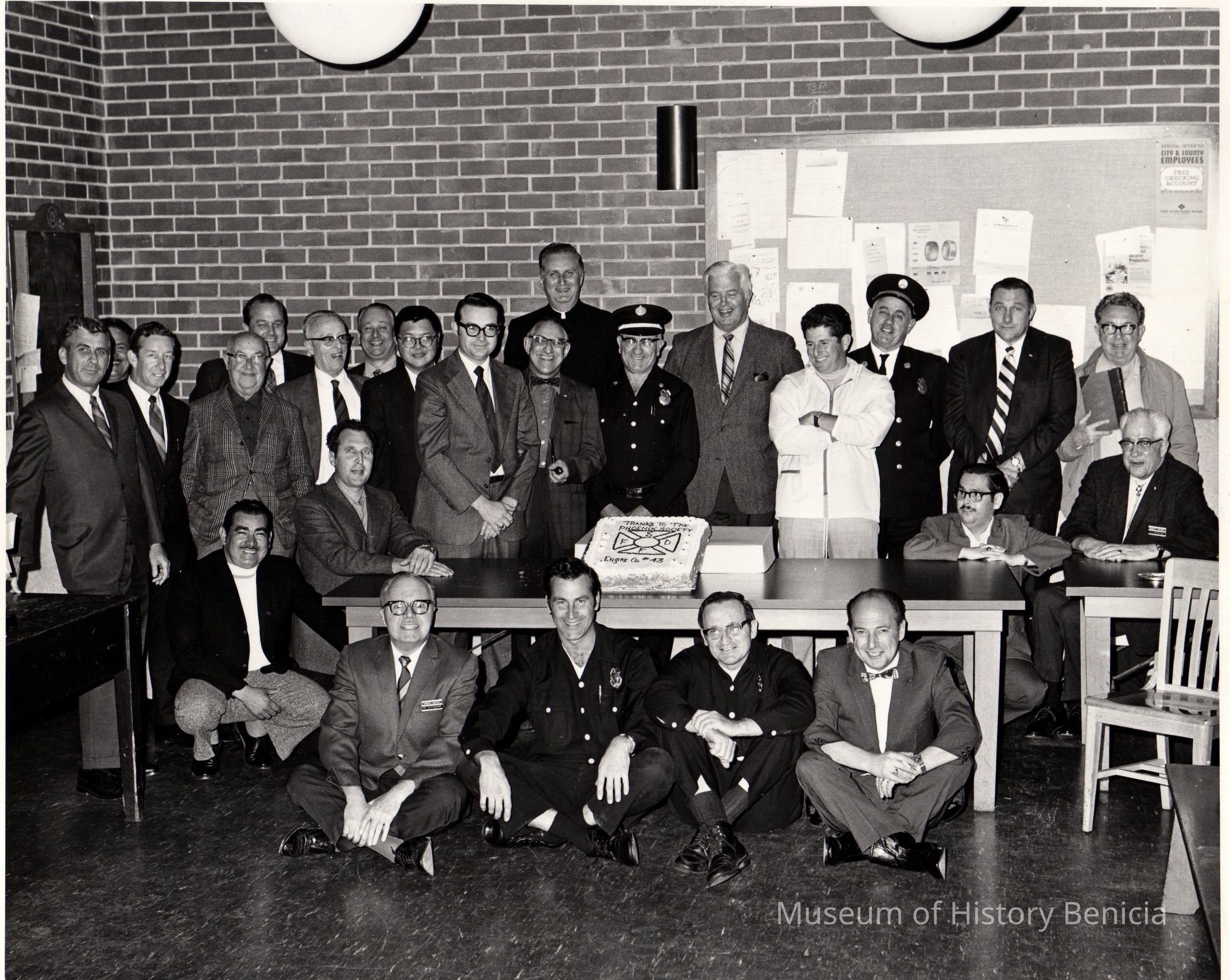 B/W photograph of a group of unidentified men, some are in uniform, around a table holding a cake decorated with "Thanks to the Phoenix Society SFFD Engine Co. #43"