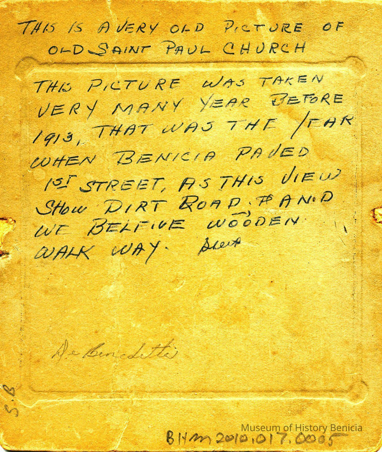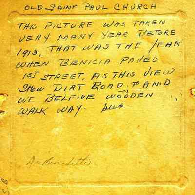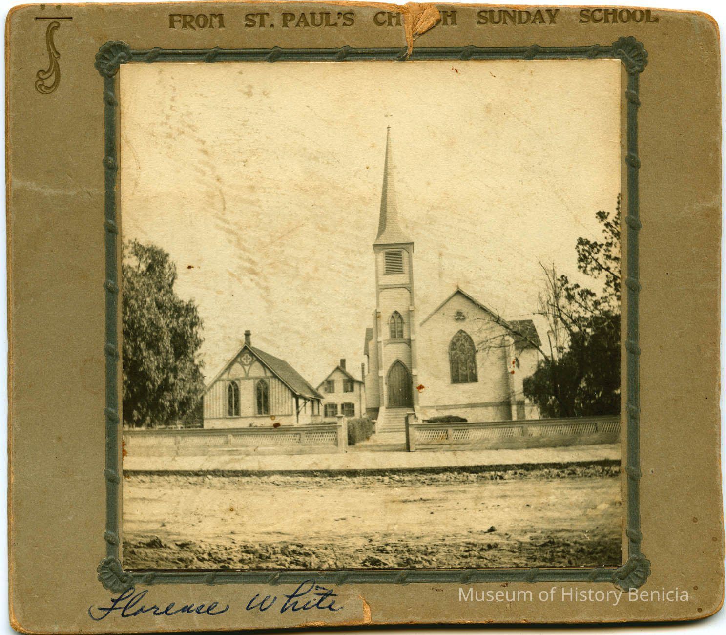 Photo on cardboard of St Paul's church. Name written on the front in ink is "Florence White". The back has an estimate of the age of the photo as pre-1913 because of the dirt roads. Also the name DeBenedetti is written on the back.