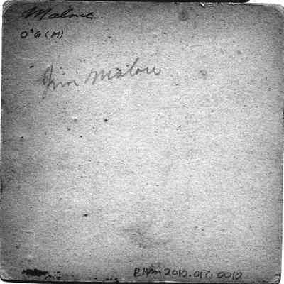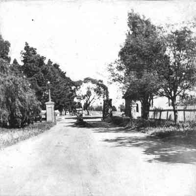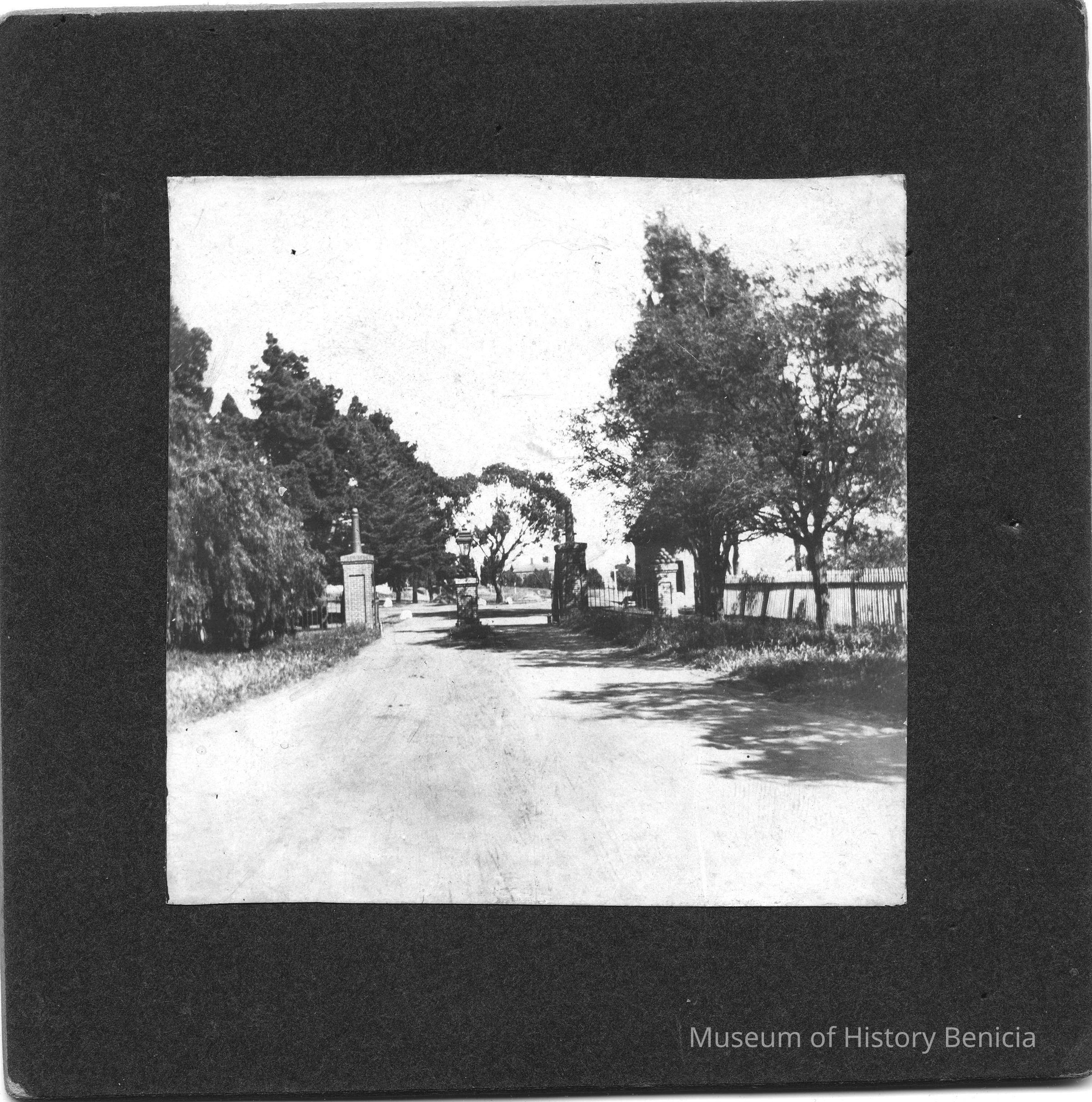 Photo on a card of the entrance to a military place. Looks like the Benicia Arsenal gate. Written on the back is "Malone" and "Jim Malone"Collection