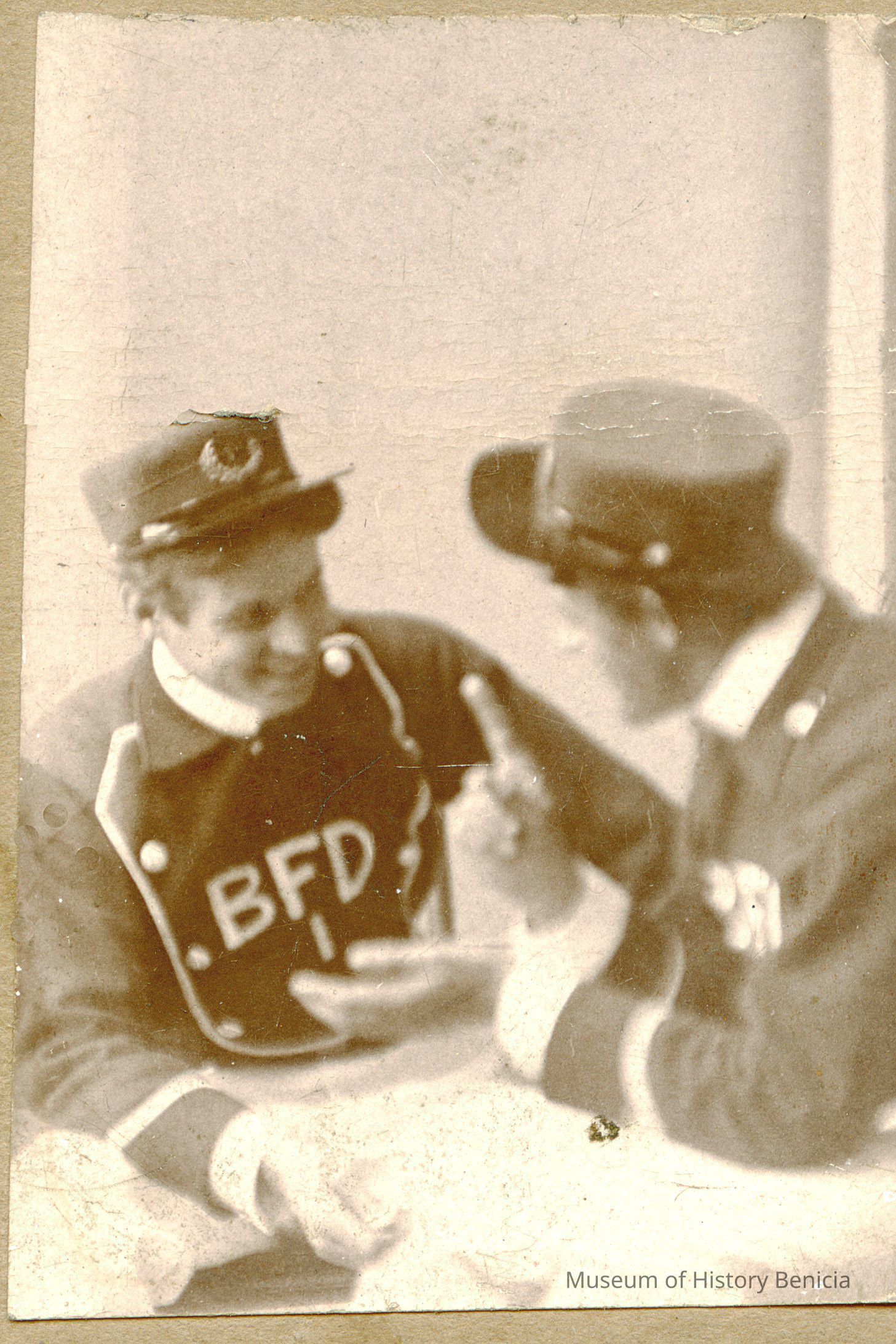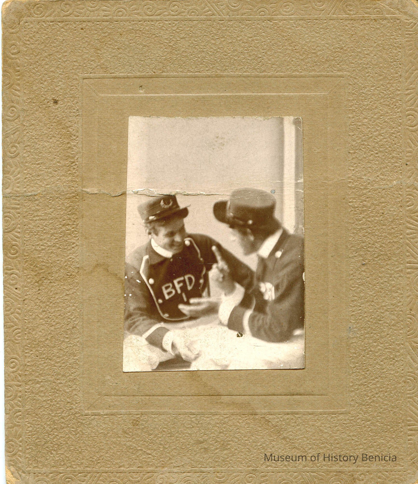 Photo on cardboard of two men in uniform talking. One has BFD on his uniform. Assume they are with the Benicia Fire Department.