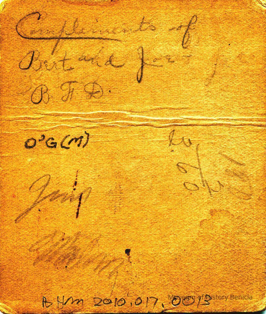 On back is written "Compliments of Bert and Joe B.F.D." Also the name "Jim Malone"Collection