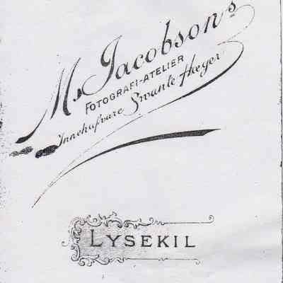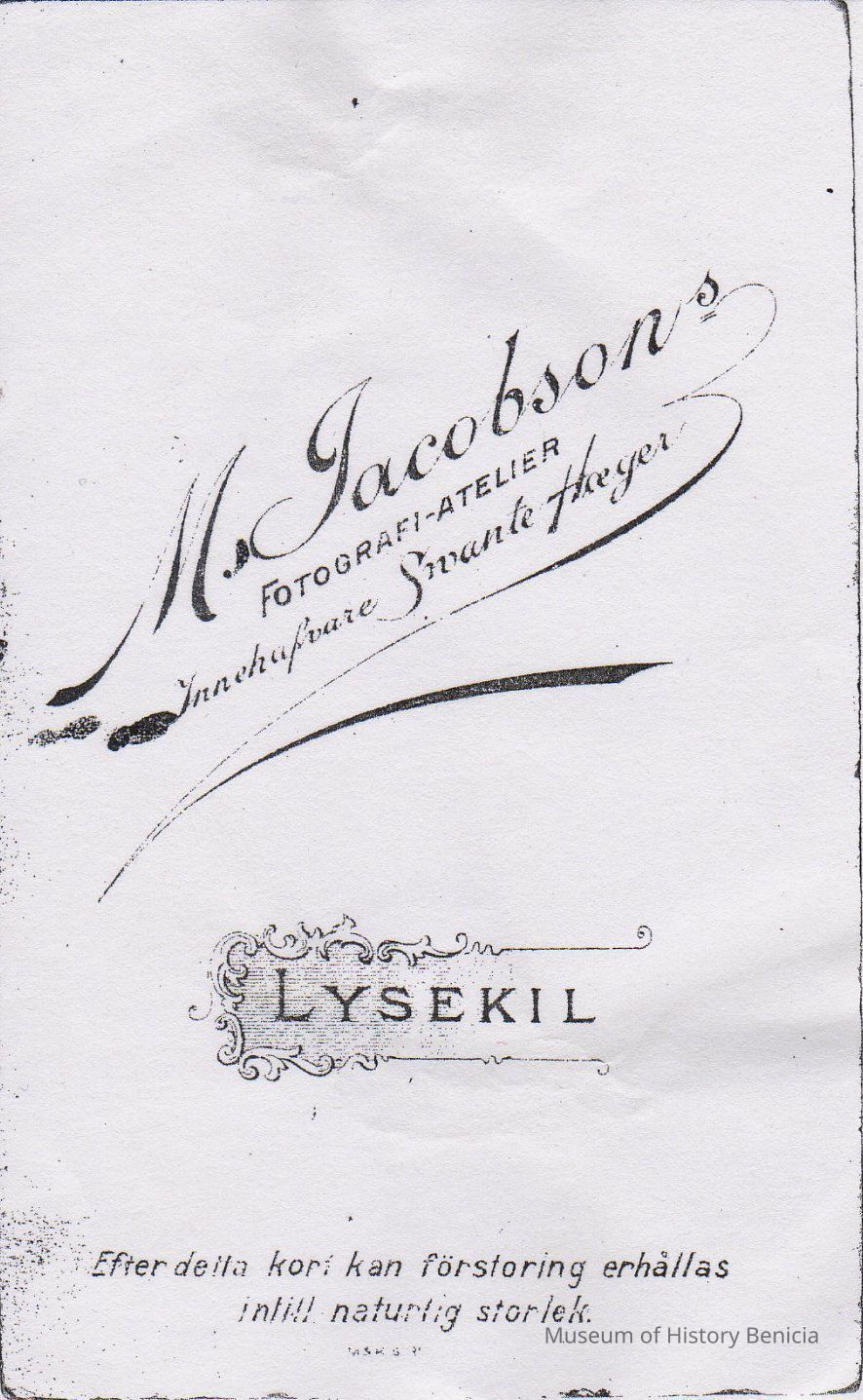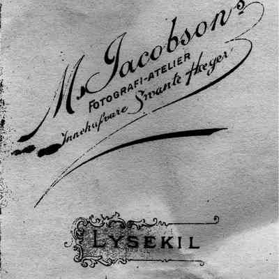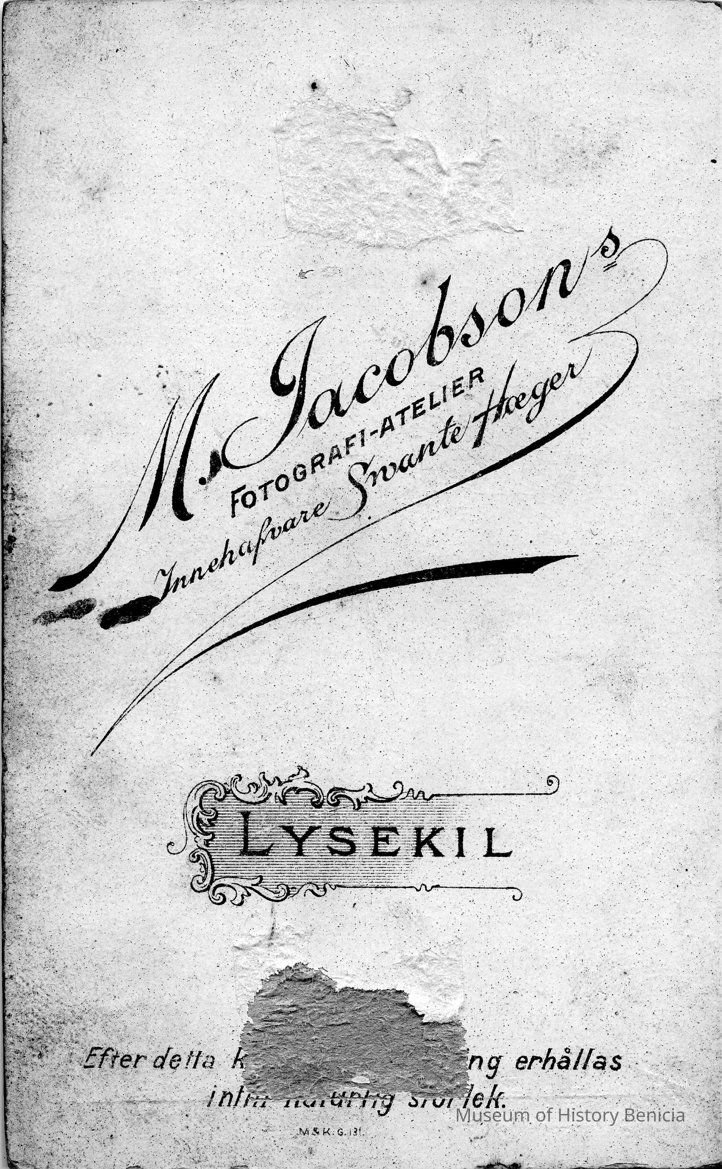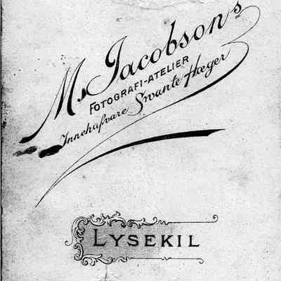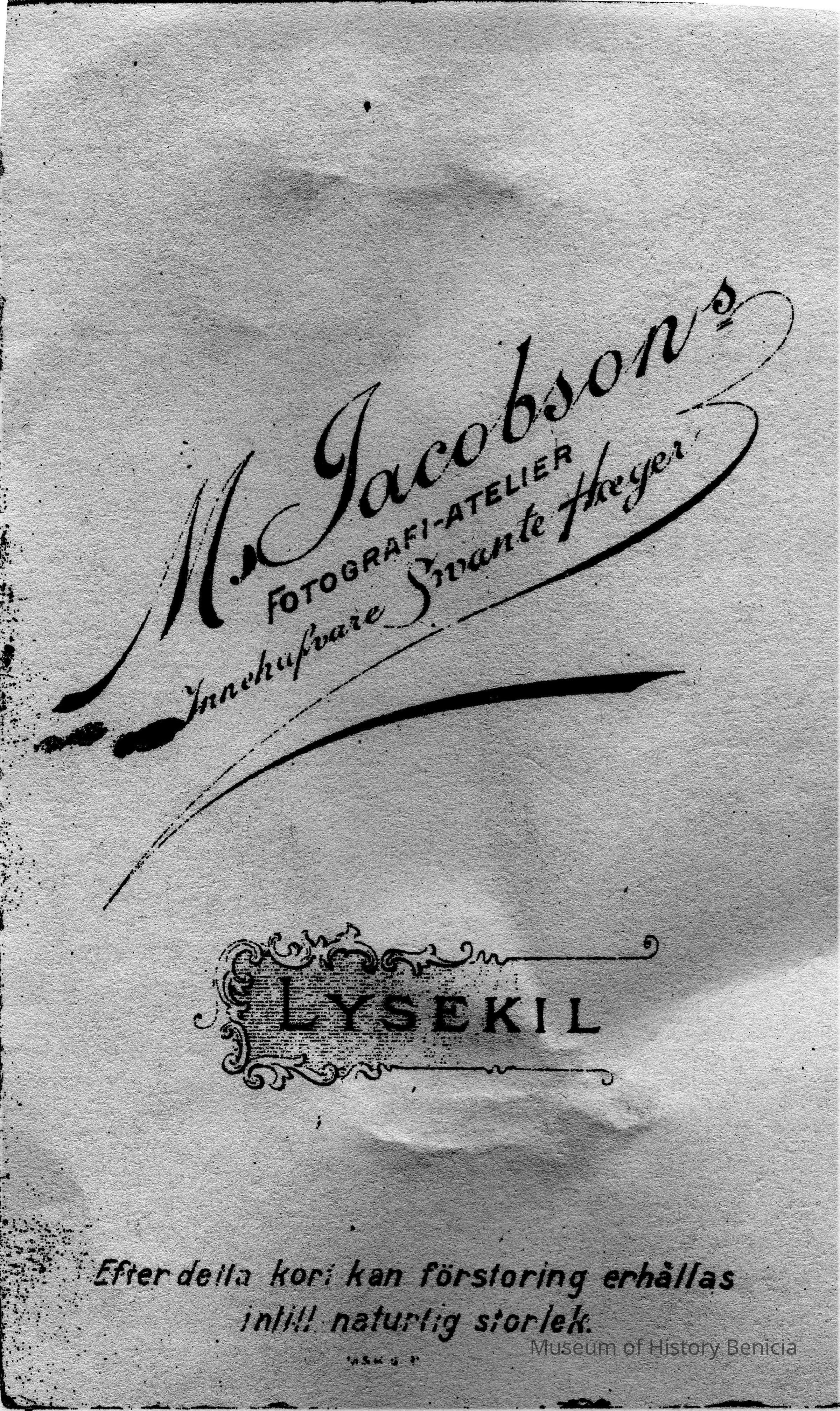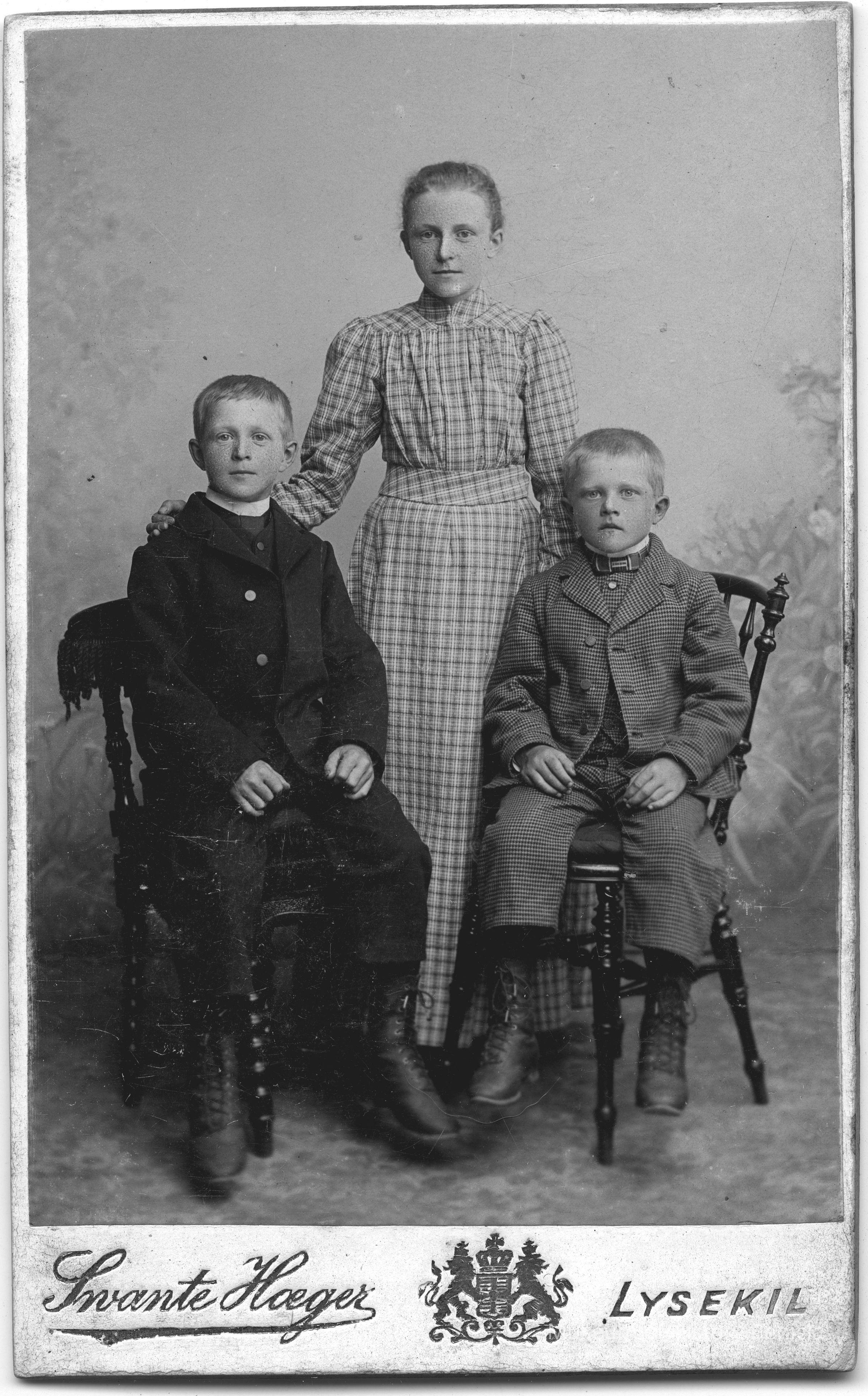 Photograph of three children, two boys seated and one girl standing. On bottom of photo, reads "Swante Hoeger", then a coat of arms - possibly Sweden, followed by "Lysekil". On back it reads, "M. Jacobson's Fotograpfi-atelier, Innehafvare Swante Hoeger". Fotografi-atelier would translate to Photopraph Studio, Innehafvare translates to "occupant". Lysekil is printed in the middle. At bottom it reads "Efter detta kort kan förstoring erhållas intill naturlig storlek" (Swedish) which translates to a warning about the card (kort) changing (erhållas) in quality.