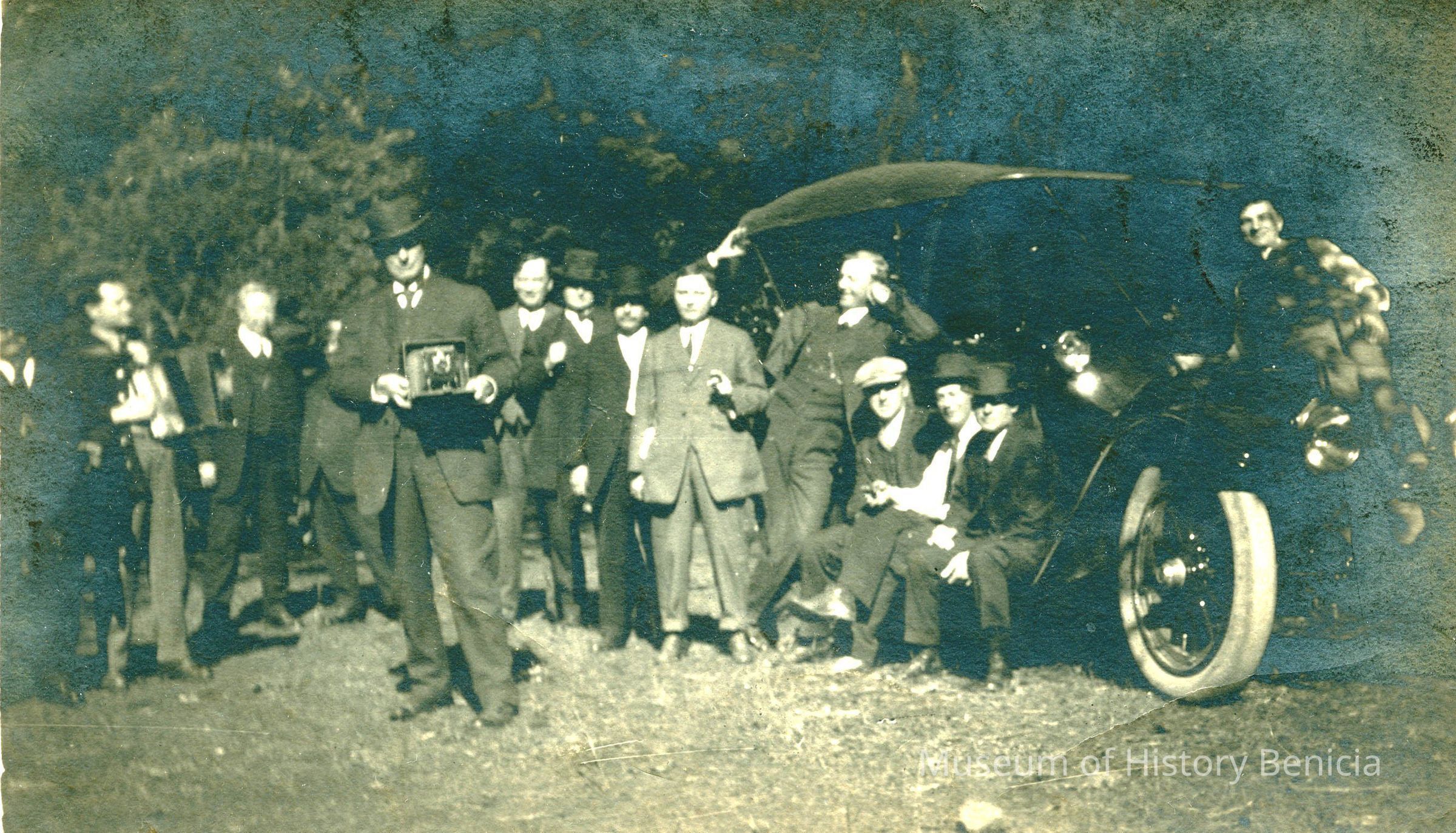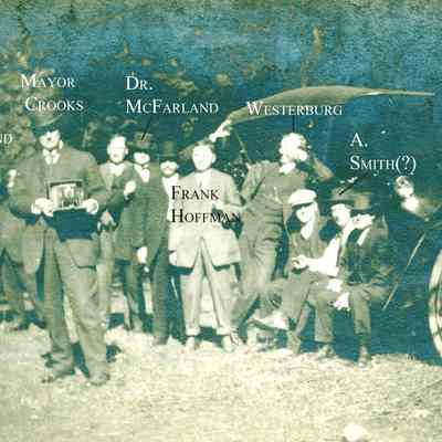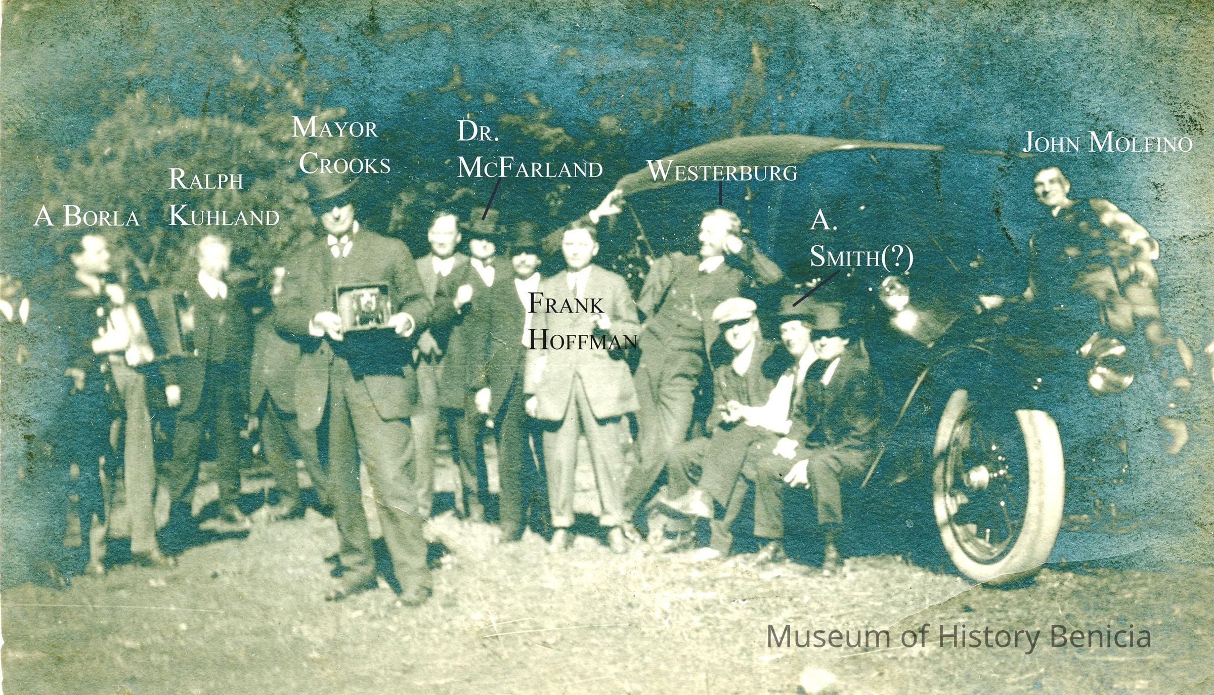 Photo of a group of guys around a car. Mayor Crooks, in front, has a camera. On the back some are named: