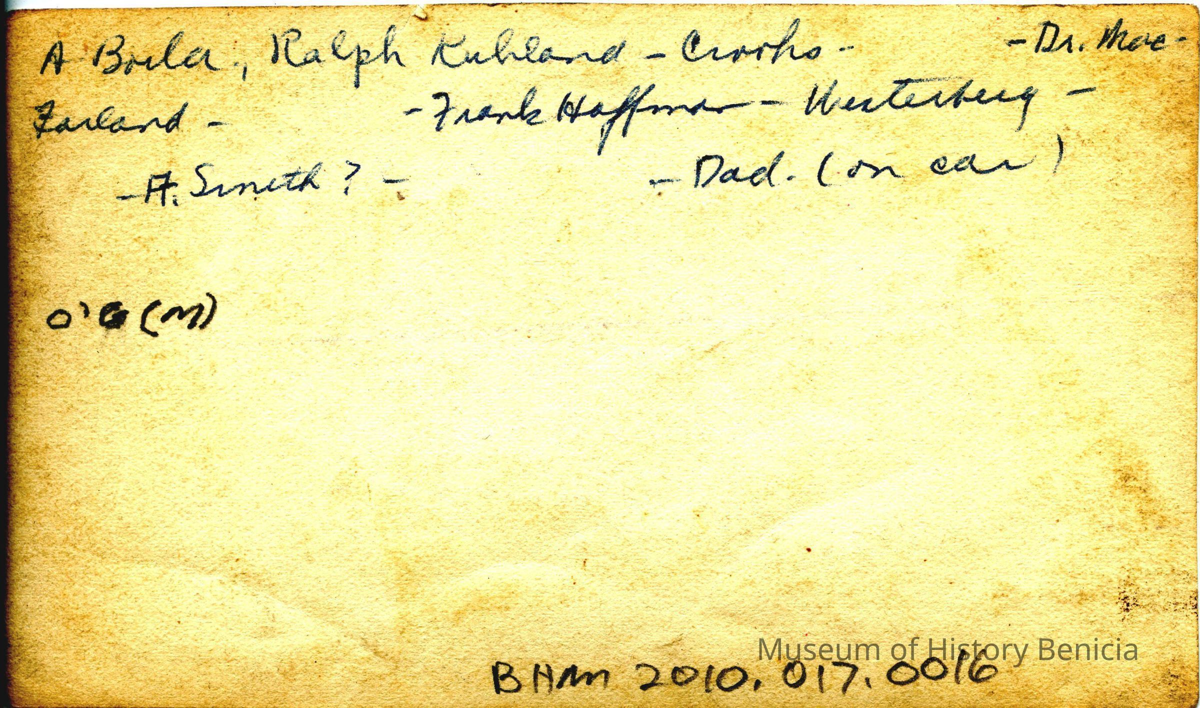 The person shown as "Dad" is John Molfino. This inscription was obviosly made by either Marguerite or Violet Molfino. Since the photo was in Benicia with the O'Grady's my guess is the person identifying the people in the picture was Violet Molfino.Collection
