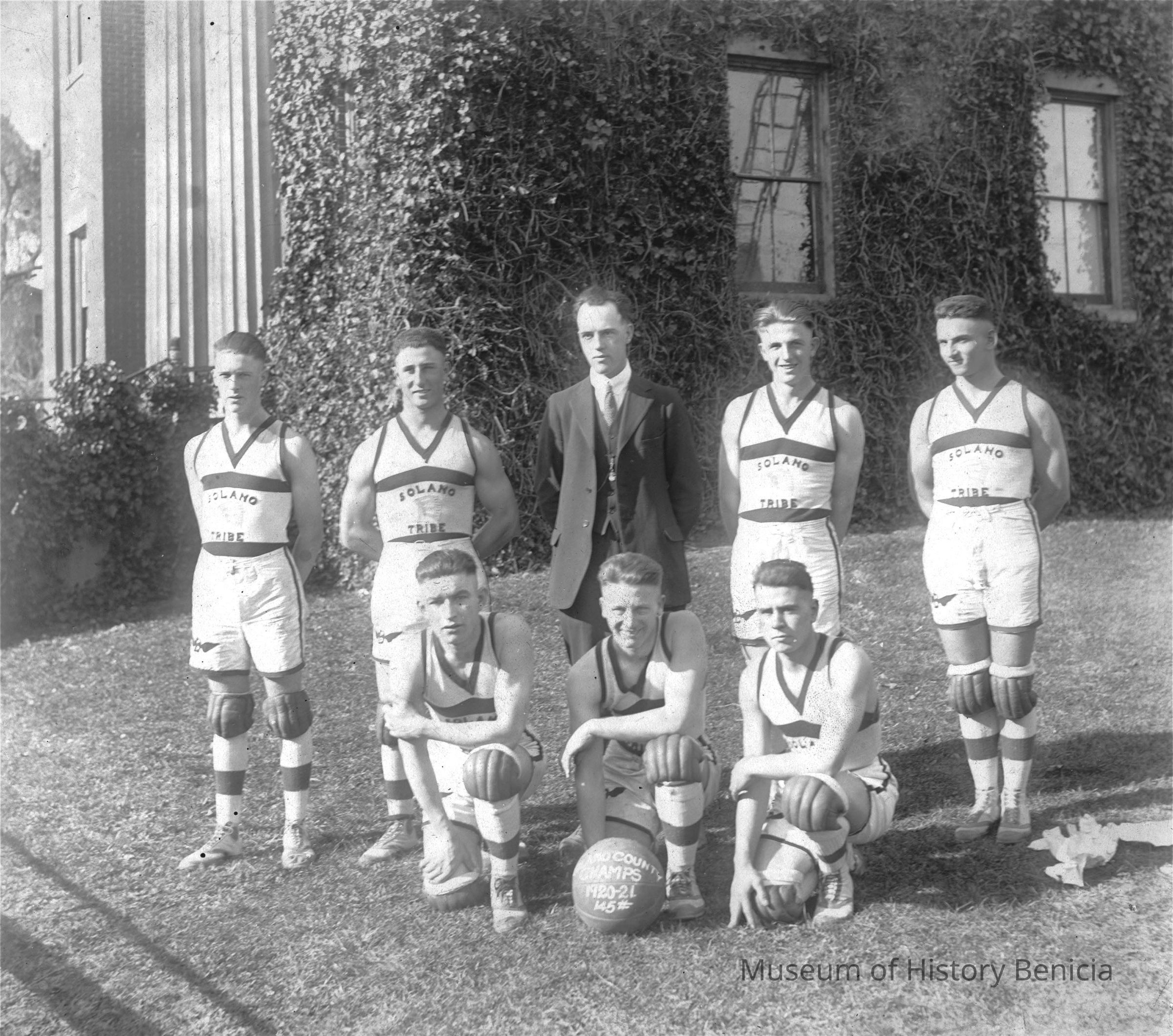 Photo of basketball players, "Solano Tribe" in front of the State Capitol. The ball says they are the Solano Champs 1920-21.